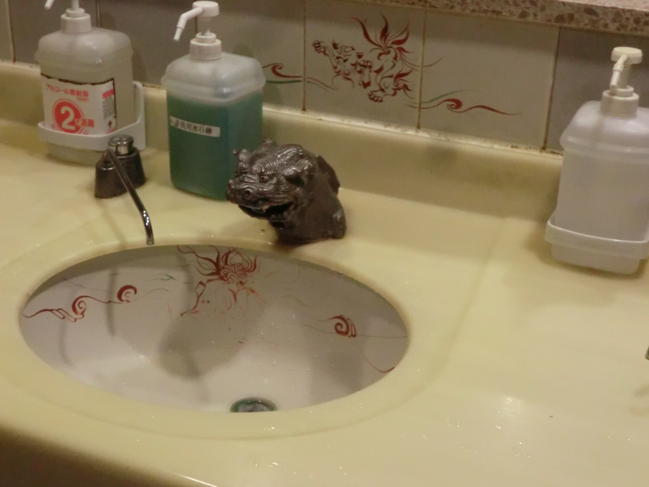 有料見学地の最終コーナーです。ほぼ、ギフトショップです。首里城関係のお土産がたくさんあります。人がたくさんいて、お土産を買い求めておりました。ユニークなのが、トイレの洗面台で、シーサーの蛇口になっております。写真をご覧ください。