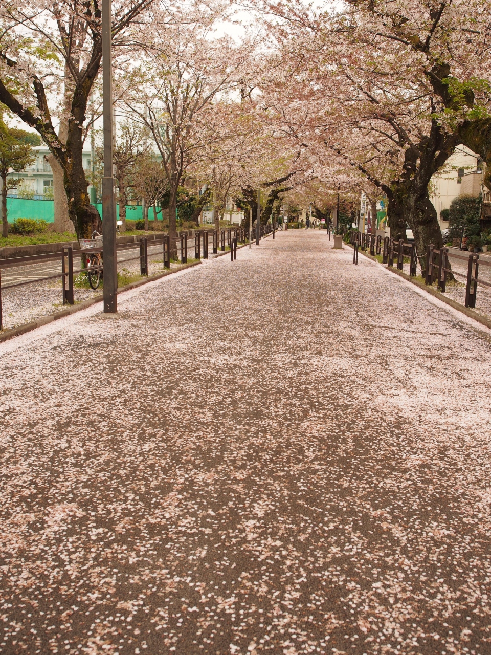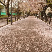 名前の通り大昔は川が通っていて、その川沿いに植えられた桜並木がどこまでも続いていて、桜の季節になると雰囲気が一変します。