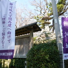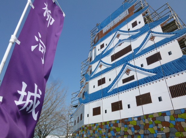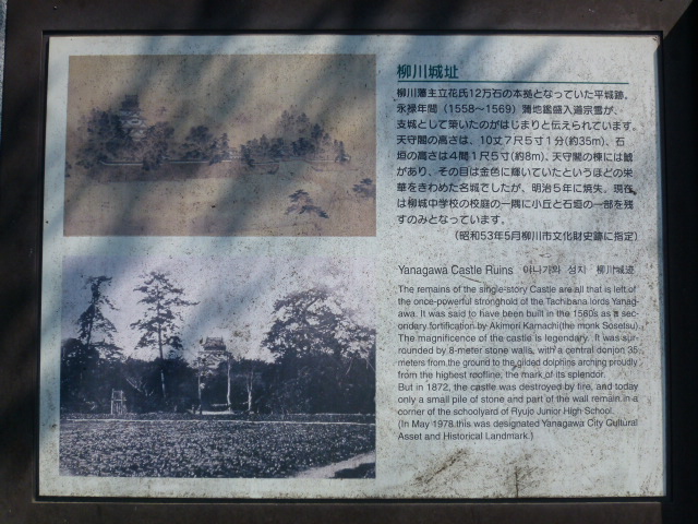 立花宗茂の居城で5層の立派な天守がかつてあったそうですが、現在は柳川高校と柳川中学校になっていてテニスコート脇を入ると往時を偲ばせる遺構はほんの少しですが石垣と街中を張り巡らされる水路網堀割が残こされています。また767号線の通り沿いからは巨大パネルに柳川城を描いて足場を組んで設置されているので迷わないと思います。