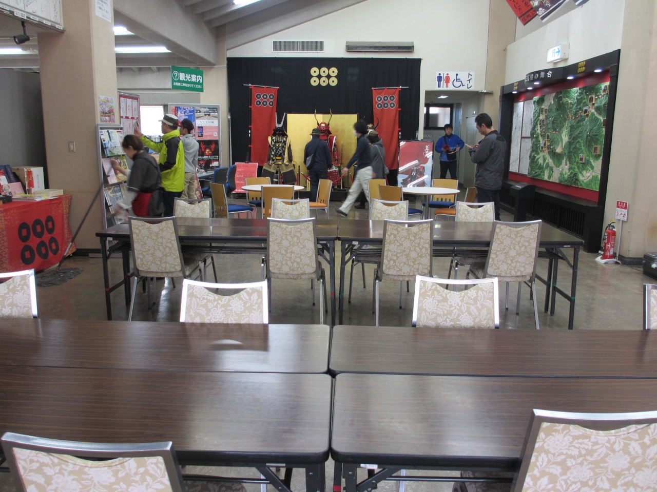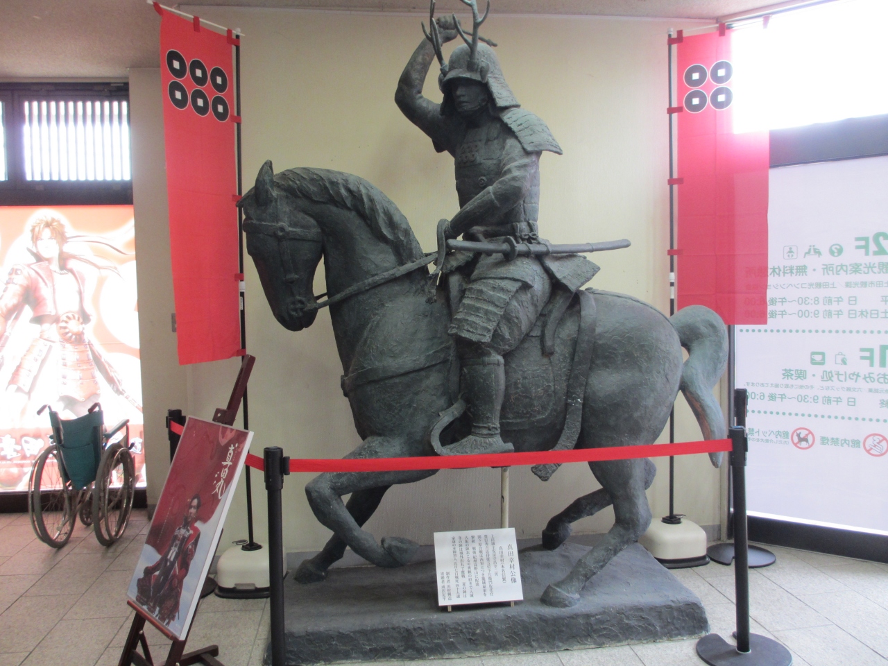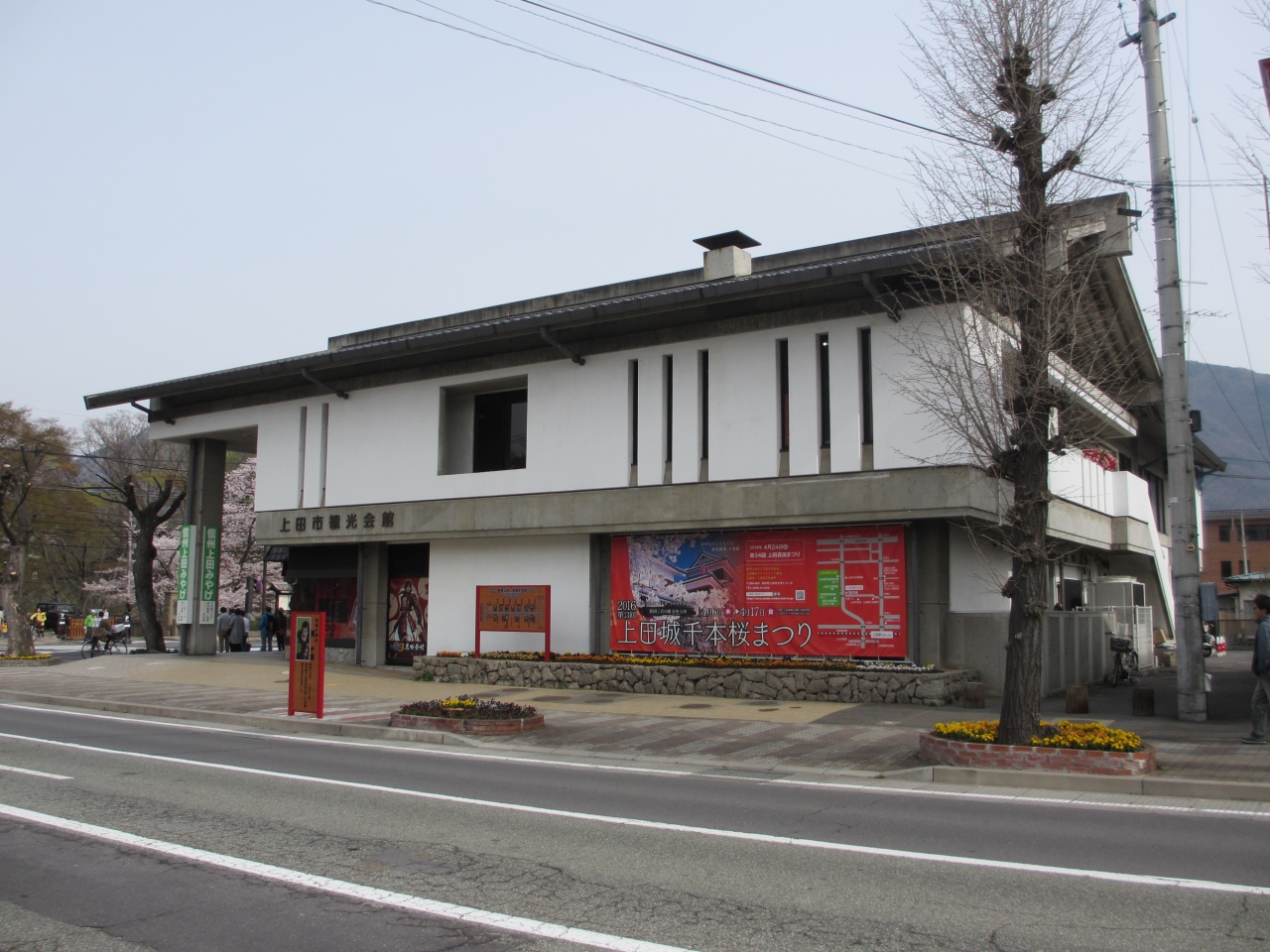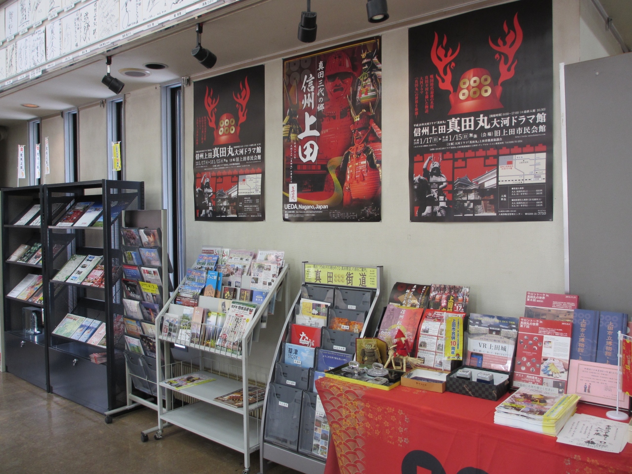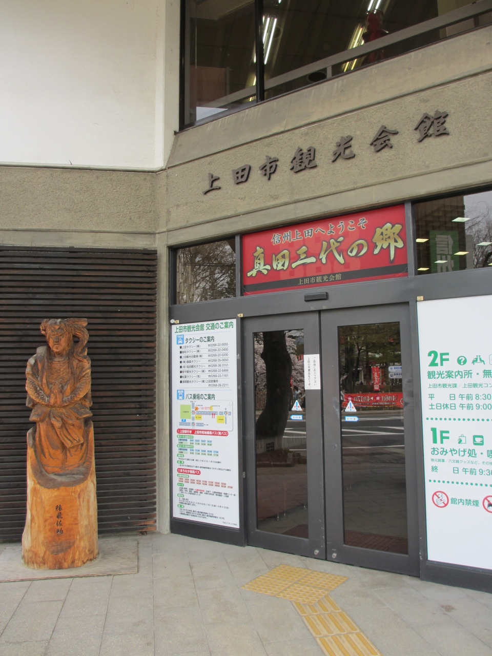 上田城跡公園二の丸橋の前にある建物です。1階には土産店が、2階には観光協会があります。1階入口には真田幸村像があり、観光協会は上田市を中心に観光パンフレットが充実しています。2階にはちょっとした休憩所も設置されています。