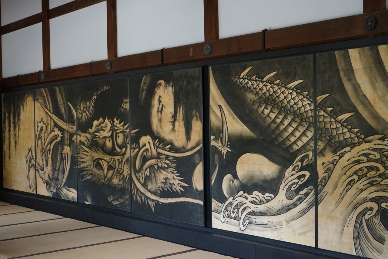 天龍寺の曹源池庭園に面する大方丈、龍の間の壁面に「雲龍図」全8面が設置されています(年間90日程度の特別公開のようです)。