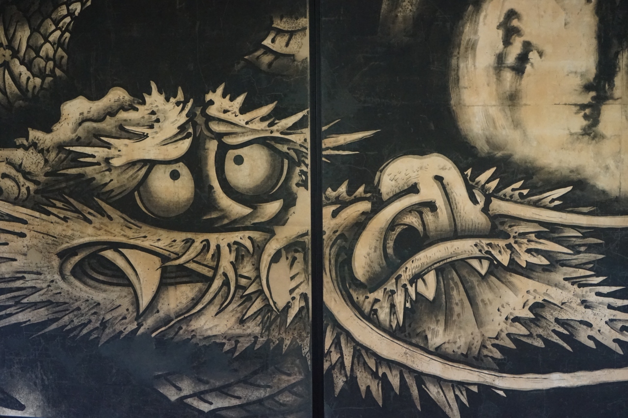 雲龍図は全8面で、並べると幅10・8メートルになる墨絵の大作。江戸時代の画家、曽我蕭白による大胆な構図と破格の迫力で龍が描かれ、日本美術の収集家、ウィリアム・ビゲローが持ち帰り、現物は1911年から米国のボストン美術館に所蔵されています。展示されているのはキャノンによるデジタル複製品で天龍寺に奉納されたものだそうです。