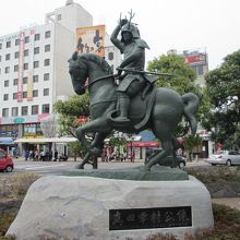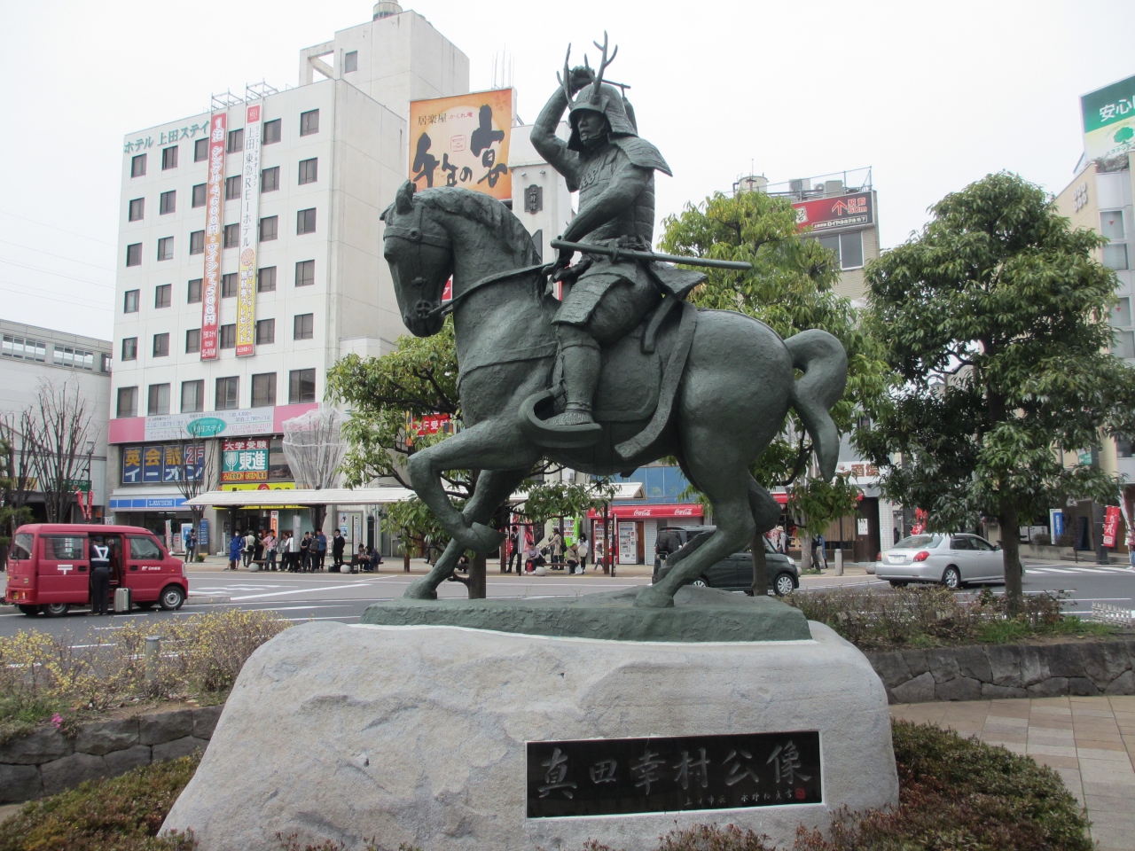 長野新幹線上田駅お城口前に建つ像です。それほど大きいものではありませんが、上田の象徴である真田幸村が、観光客を出迎えているように感じられます。駅前に建っているため、像を見た瞬間に上田に来たという印象が持てます。像のすぐそばには大きな水車も回っています。