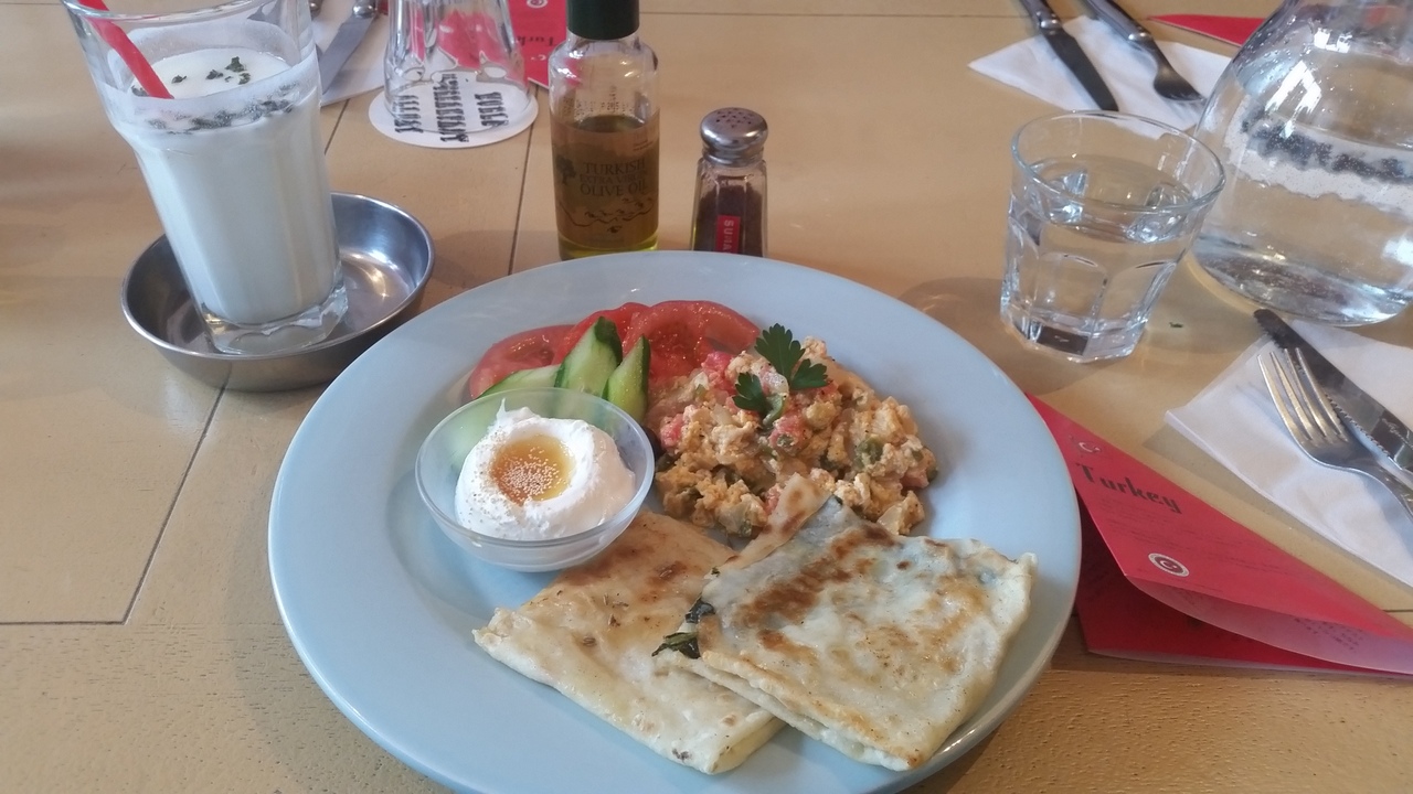 プレートにはトルコのパン、ギョズレメ、メネメ、ヨーグルト、サラダがのってます。