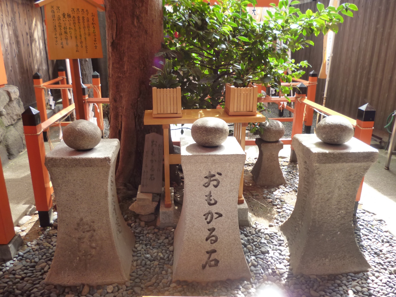 住吉神社から少し歩いていくと、大歳神社につきました。お参りをして、おもかるいしをやってみました。まず、そのまま持ちあげて重さを覚えておきます。次に、願い事をしてもう一度持ちあげます。その時の重さの具合で、かなうかどうかがわかります。