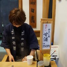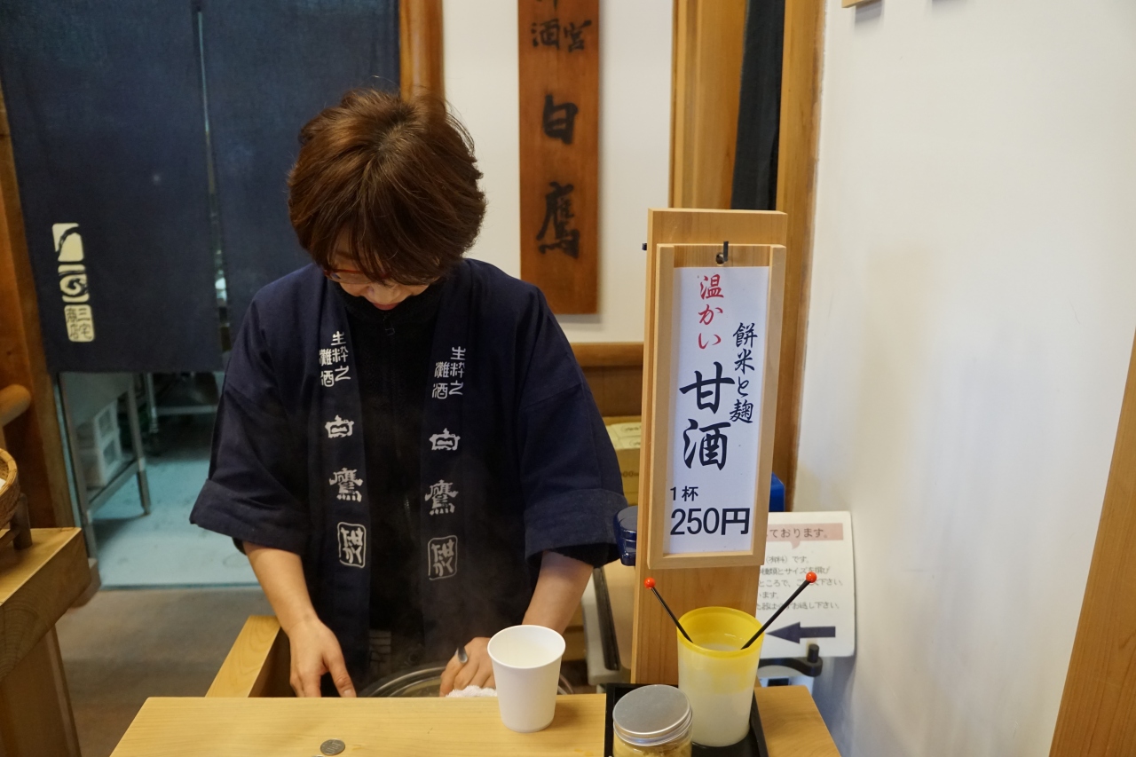 おはらい町には甘酒を売る店がポツポツあって、私はこの白鷹でいただくことにしました。店内は白木のハイカウンターがあって、皆さんそこで悠々お酒を飲んでいる人も。注文すると白い紙コップに甘酒を注いでくれて、はいどうぞ。甘い味で、ちょっと気持ちが落ち着きました。