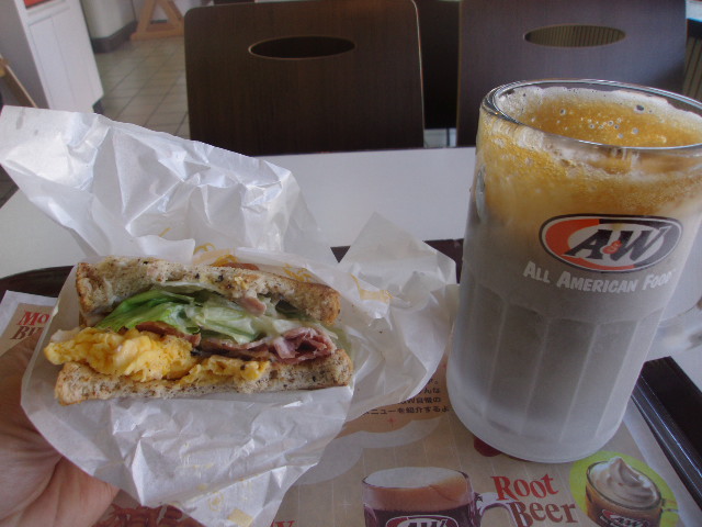 沖縄と言えばA&W(通称エンダー)を連想される方も多いかと思いますが、殆どの店舗は沖縄本島内にありますので、それ以外としては宮古島内の店舗と共に貴重なお店だと思います。宮古島は空港にもお店があるので2店舗ありますが、石垣に関しては現状ではこちらのみで、まあ本土にはないのでこの言い方もおかしいかとは思いますが、一応日本最南端(沖縄最南端)のエンダーということになります。朝9時からとのんびりした営業スタイルですが、ちゃんと11時まで朝メニューが提供されています。ルートビアもジョッキで提供されていますし、勿論お替り自由です。