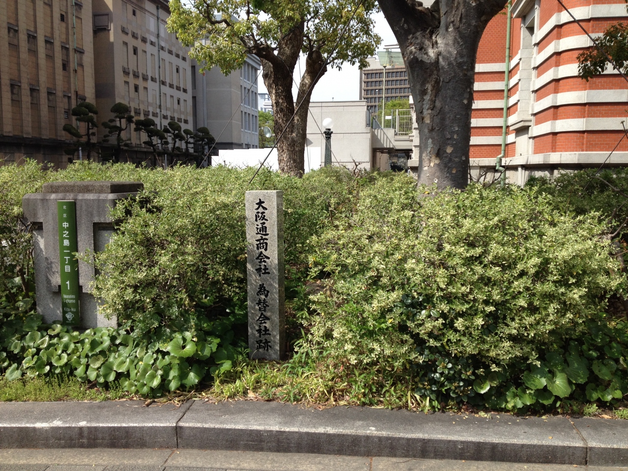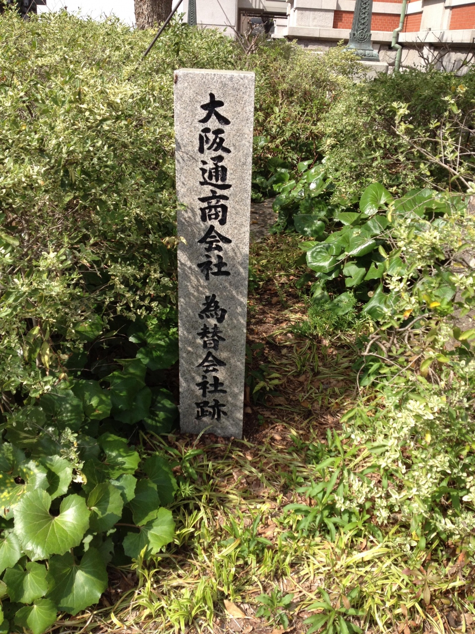 中央公会堂の裏側、市役所方向に川沿いを歩いていくと(肥後橋からだと川沿いに中央公会堂まで続く道)、に石碑だけポツンとあります。近代の銀行のはしりともいえる施設だったそうです。淀屋橋駅が最寄りと思われます。