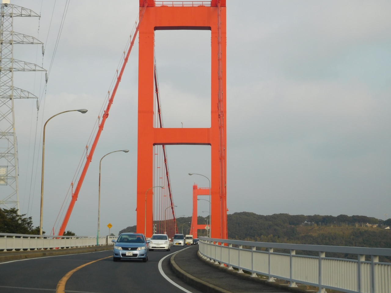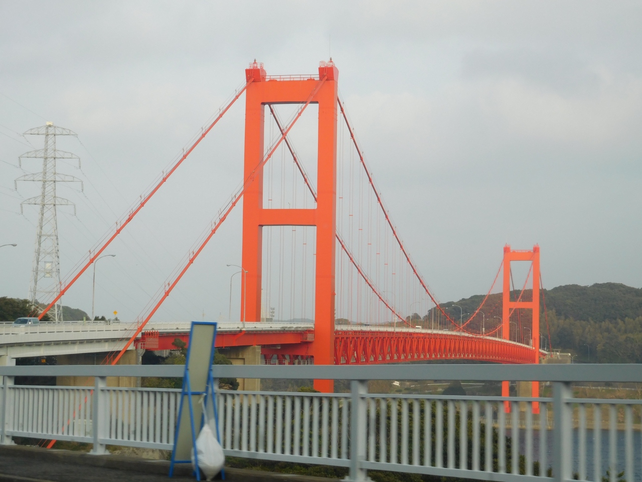平戸島と本土(田平町)を結ぶ、鮮やかな朱塗りの吊り橋です。全長665mで、トラス吊橋構造になっています。以前は有料でしたが、現在は無料で通行する事が出来ます。遠くからでもはっきりと分かりやすく、平戸城の天守閣からも見る事が出来ました。