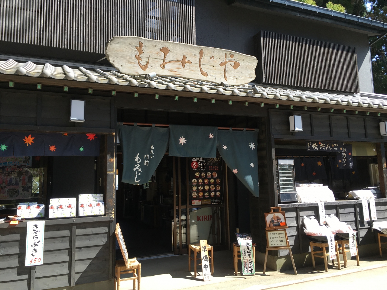 高尾山薬王院の山門前にある食事処です。食堂の営業は10時からでしたが、お土産類は10時前でも購入できました。店先では炭火でおやきやお団子を焼いています。近くにベンチがあるので、参拝前にゆっくり休憩ができますね。
