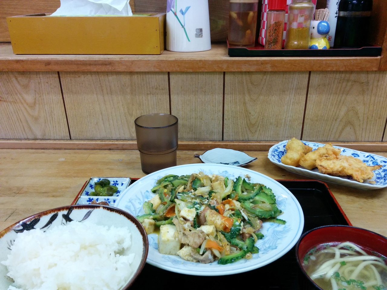 お店では、「ゴーヤチャンプル」定食と、「くになか食堂」名物の100円「天ぷら(3個)」を注文しました。