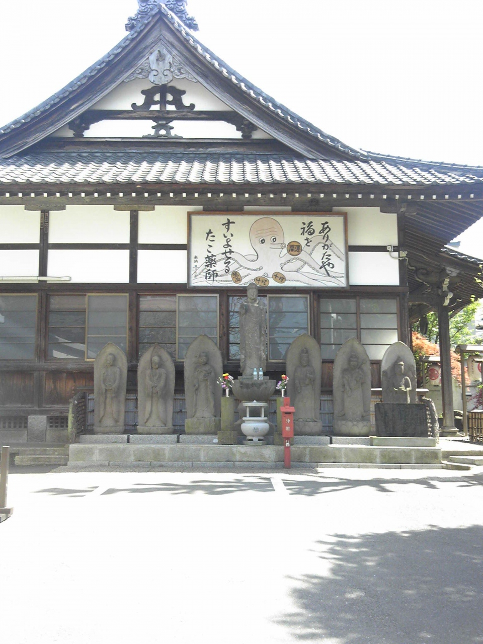東急電鉄の不動前駅より、不動前商店街を抜け、目黒不動尊へむかう通りを歩いていくと、かわいいタコの絵が描いたお寺が見えてきます。3匹のたこが蓮華座にのる薬師如来像から蛸薬師をよばれるようです。福を吸い寄せるということで参拝者が訪れます。