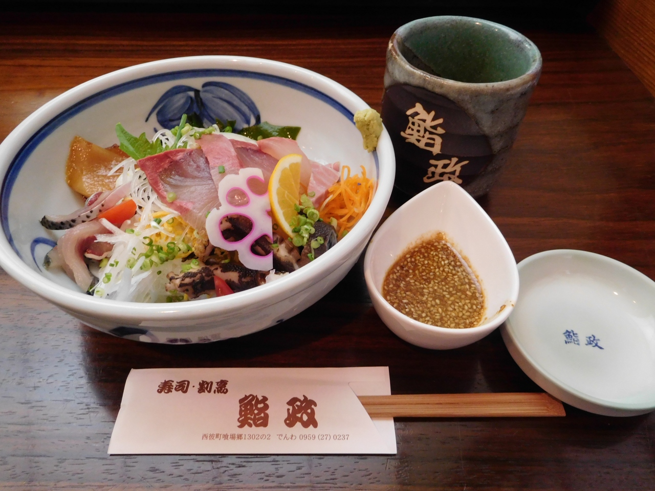 「春のさいかい丼フェア」のマップにお店の紹介があったので行ってみました。大きな鳥居の反対側にある道を入って奥の方まで進んで行くと「鮨政」がありました。休日のお昼時は、結構混んでいました。カウンター席とお座敷があります。さいかい丼は、単品の他に、お味噌汁とデザートのついたセットメニューもありました。カウンターに座り、お寿司屋さんのどっしりとした湯のみでお茶を頂きながら、出来上がるのを待ちました。見た目にも色鮮やかで美味しそうな丼が出てきて、特製のごまダレをかけて頂きました。お寿司屋さんなので、お魚がとても美味しかったです。お得な値段で、とても美味しい「鮨政さいかい丼」が食べれて良かったです。