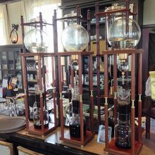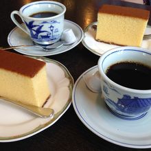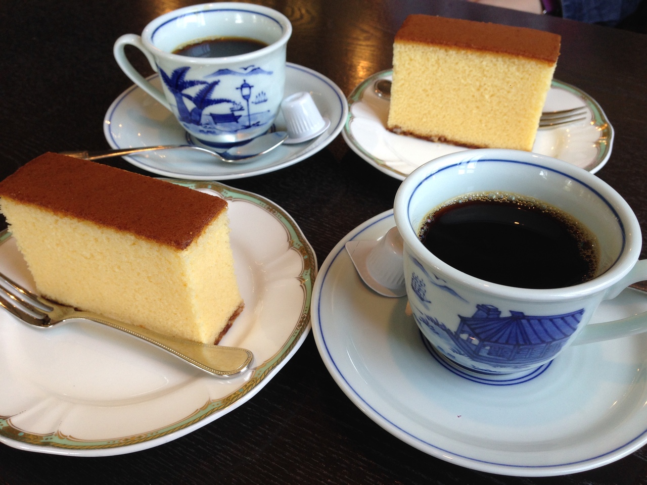 巨大なサイホンで淹れる美味しいコーヒー。カステラはグラバー園からほど近い、長崎堂のものです。