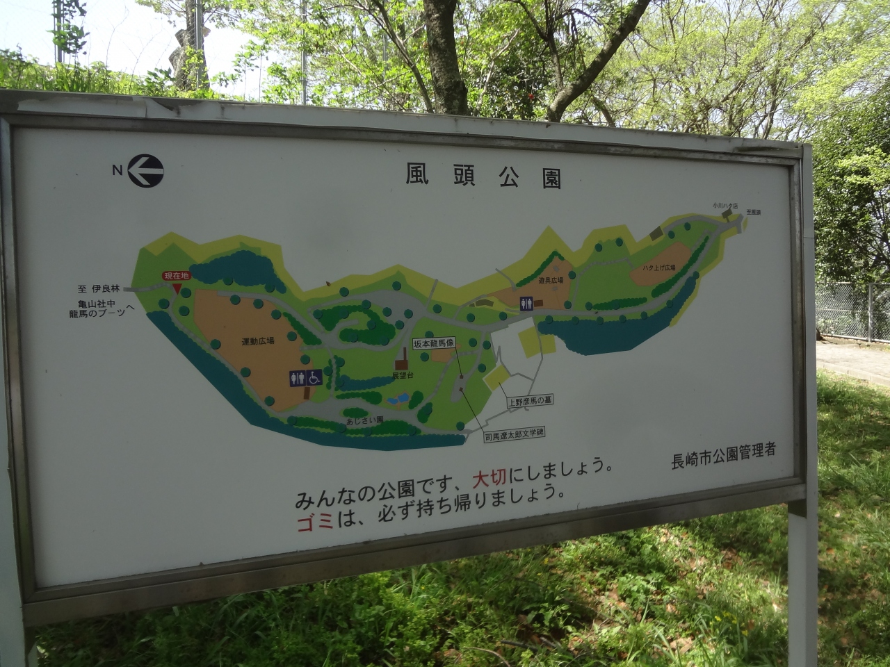 標高151メートル程の高台にあります。坂本龍馬の像があるとのことで訪れてみました。路面電車の新大工町を下車し、若宮稲荷神社などを通って公園を目指します。でも登り坂が続きなかなかきつかったです。但しその分眺めが良かったです。それに大きな龍馬像も圧巻でした。像は眼下の長崎市内を向いていて、遠くを見つめる龍馬の目が印象的です。他に展望台があったり、広場や運動場があったり。平日のこの日は小学生が遠足に来てました。