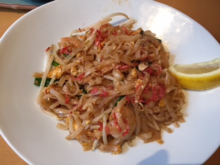 私が注文したのはタイ風屋台焼きそば.甘い味付け.途中レモンを絞るとさらにおいしかったですよ!お好きな方はテーブルに置いてあるナンプラーをかけることもできます.