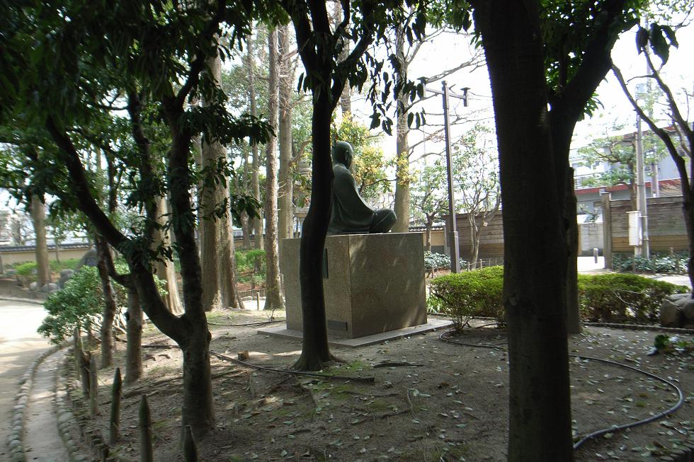 調べに来て、それを題材に心中物を書いたようです。やがて大阪に居を移し、公園の脇となっている廣齋寺の離れをもの書きの場所にした。この辺り一帯は、区画整理事業の残地か、公園として整備されている。