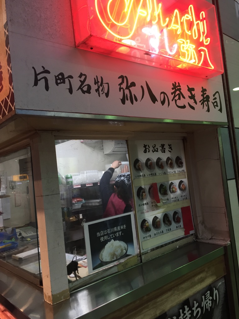 飲んだ締めに言うことでおみやげの巻き寿専門店。中の具もいろいろあるようですが今回は鉄火の巻物をホテルに買って帰りました。金沢の締めはこの店なのでしょうかと観光客である私は判りませんが意外に混んでいました。