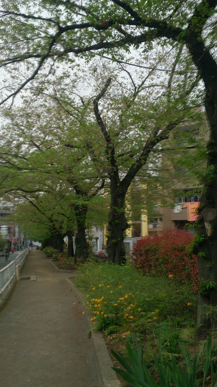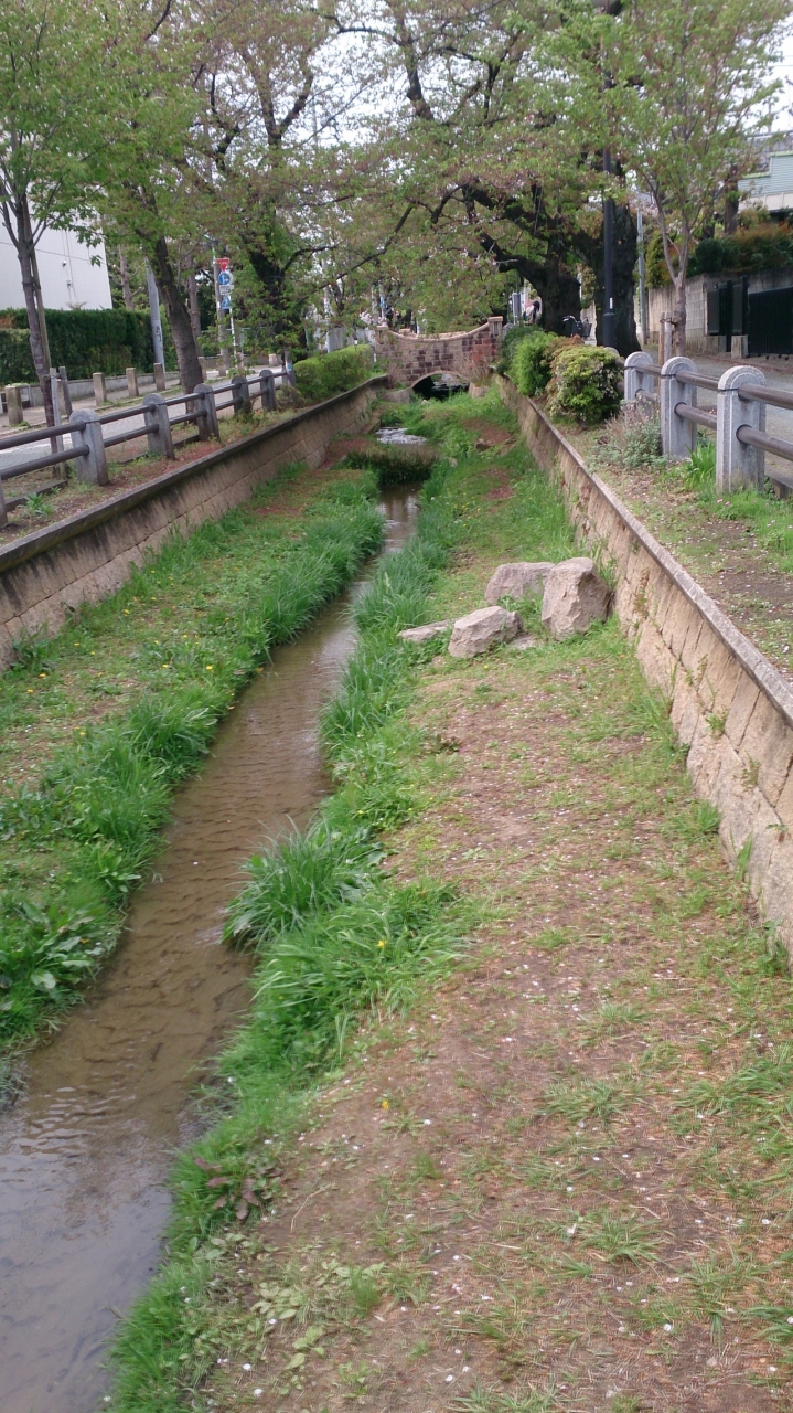 東工大大岡山キャンパスから自由が丘方面に向かって歩いていると、呑川緑道に出会いました。桜は散っていましたが、咲いている時はとてもきれいだったことでしょう。どんどん歩いていくと日体大キャンパスのところでそれまでの暗きょから水の流れが現れ、感激でした。