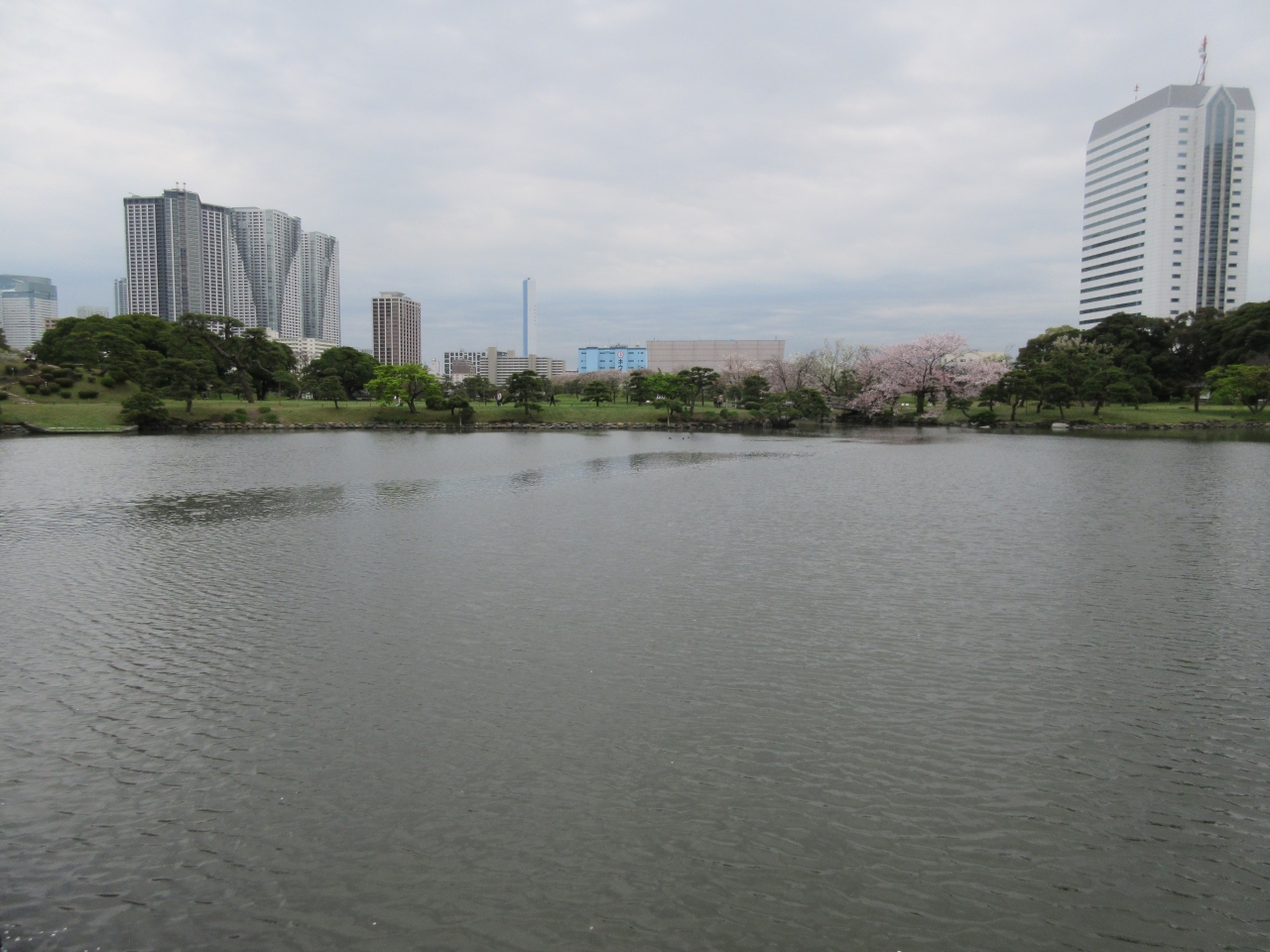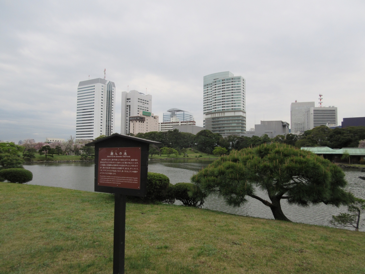 浜離宮恩賜庭園の中央付近にあって、東京湾とつながっています。潮の満ち引きに応じて水門を開閉、池の水の出入りを調節されます。池には海水魚が泳いでいますし、鴨の姿もたくさん見られました。「中島」には御茶屋がありました。