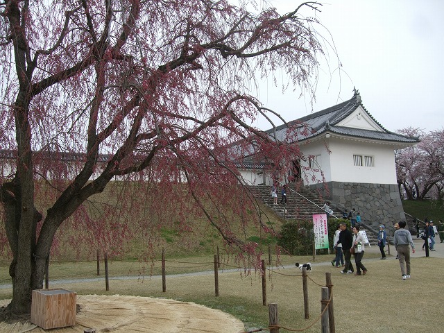 山形城東大手門から入った広場に、最上義光騎馬像が立っていて、大きな紅しだれ桜の古木が2本あります。紅色の見事な花を見せてくれます。