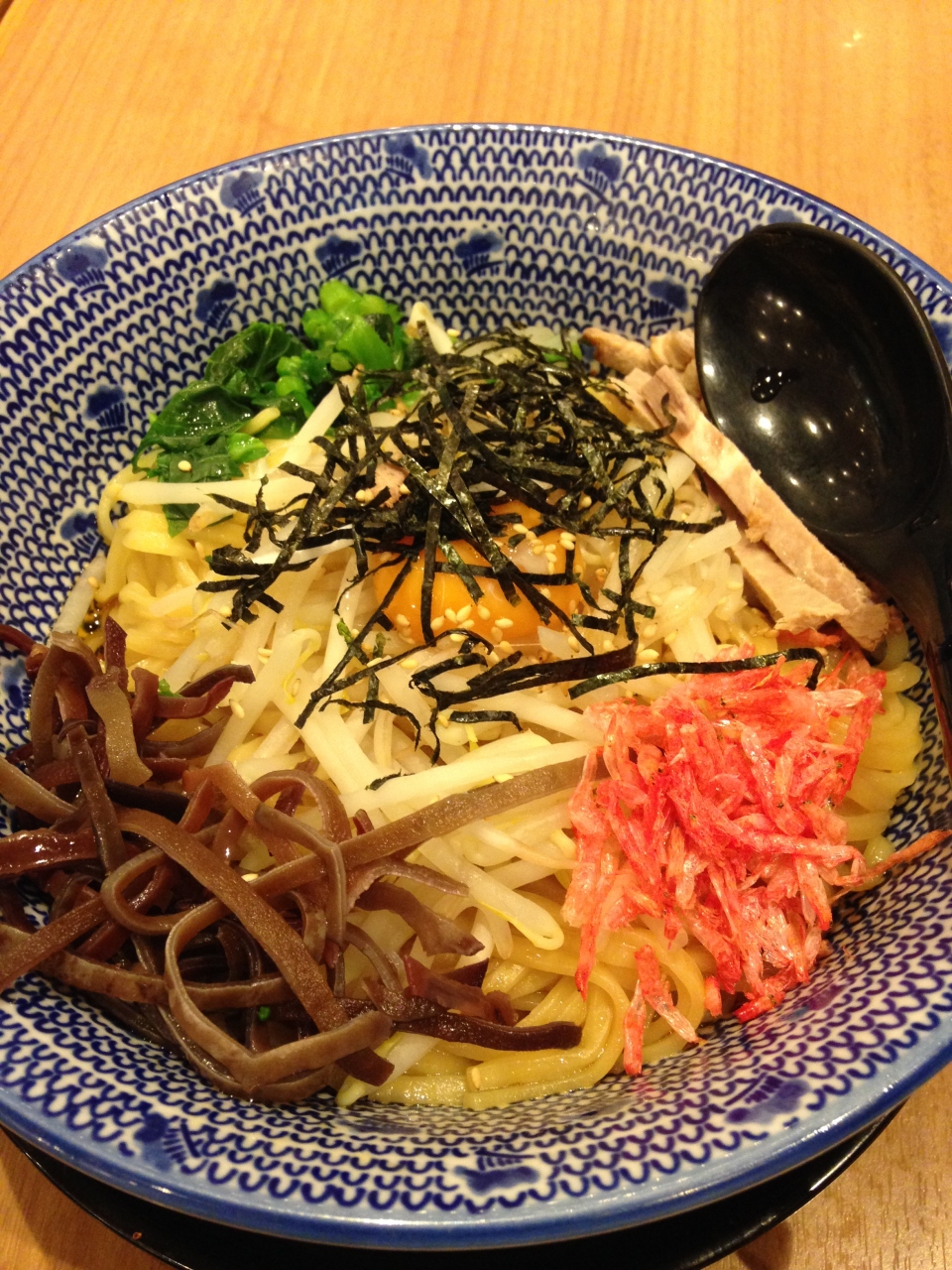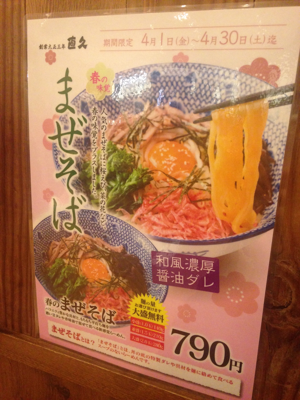 人気のまぜそばに菜の花やエビなど,旬の味覚がプラス。