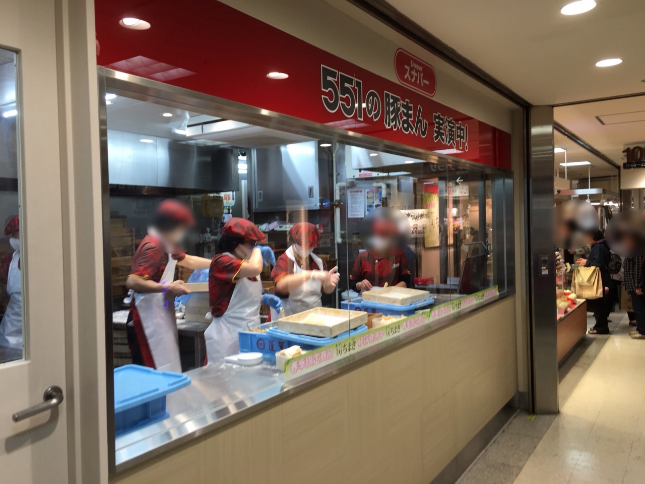 梅田阪神百貨店の地下食料品売り場の551蓬莱。阪神名物イカ焼きとなり。