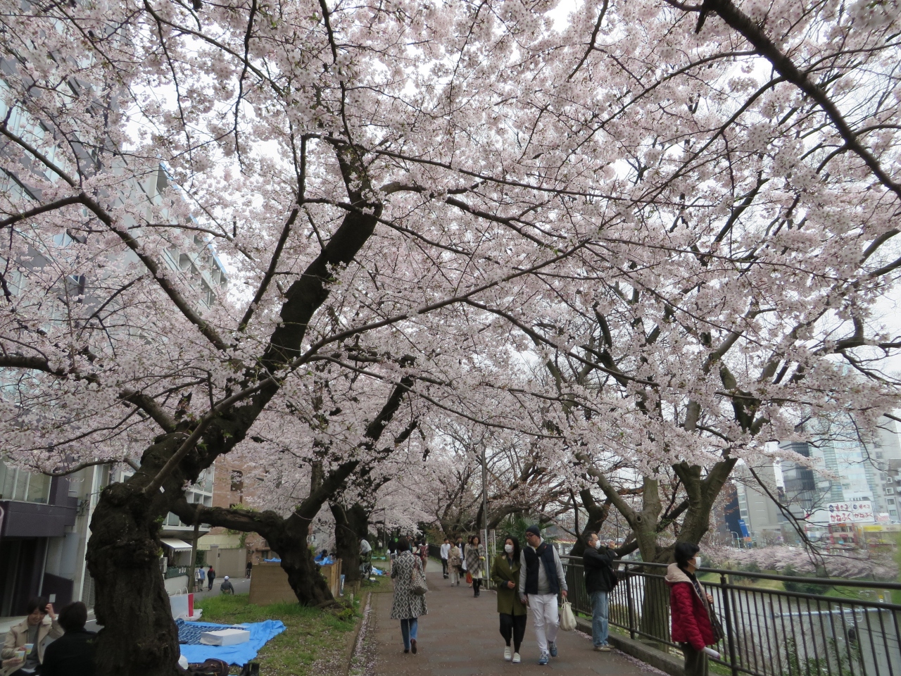 JR総武線の飯田橋駅から市ヶ谷駅まで、お濠に沿って延びている公園です。桜の季節に行きましたが、桜の下を歩きながら、お濠の対岸(北側)の桜も見ることができました。桜の下の歩道沿いには、大勢の人がシートを広げてお花見をしていました。