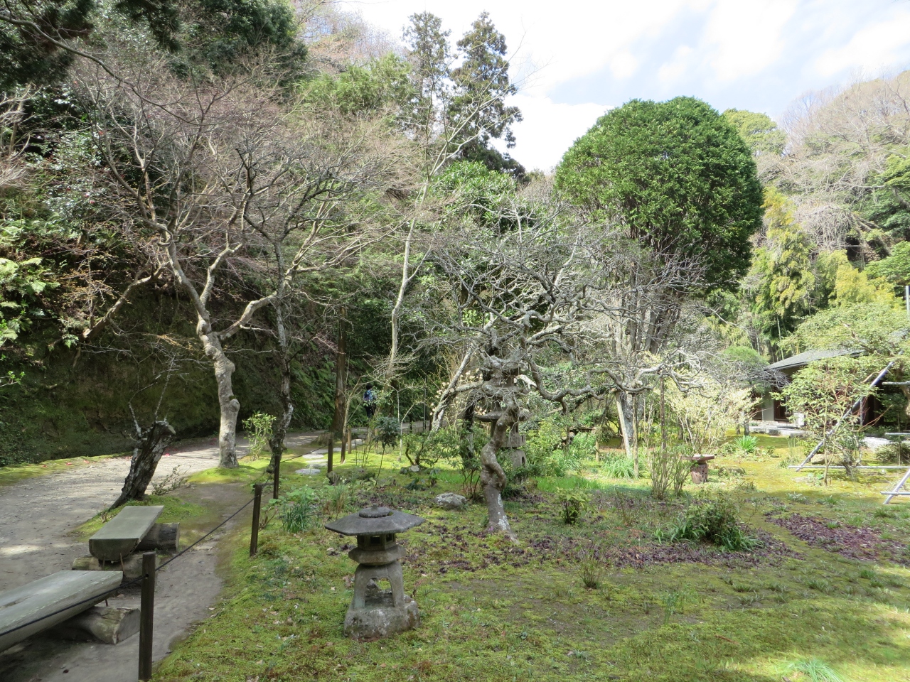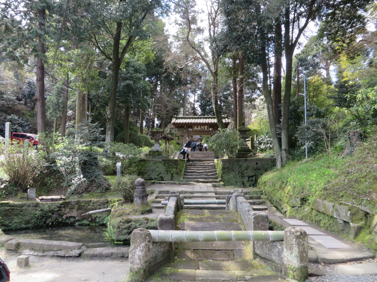 北鎌倉駅から線路沿いを歩いて5分ほどで浄智寺の入口に着きますが、そこから長い階段を上って、お寺の入口に着きました。拝観料を払って中に入ると、庭園や竹林がありました。庭園は、あまり整備されておらず、雑草が生えていました。