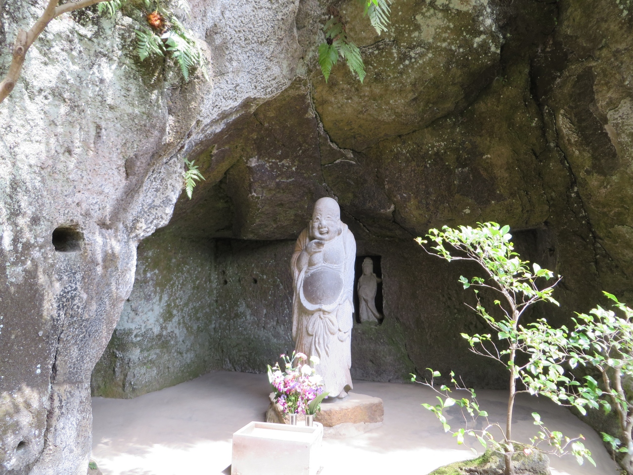 浄智寺の入口で拝観料を払って中に入ると、敷地の一番奥に布袋様の像が祀られていました。人と同じくらいの大きさです。布袋様のおなかをなでるとご利益があるのでしょうか?おなかの所だけ、つやが出て光っていました。