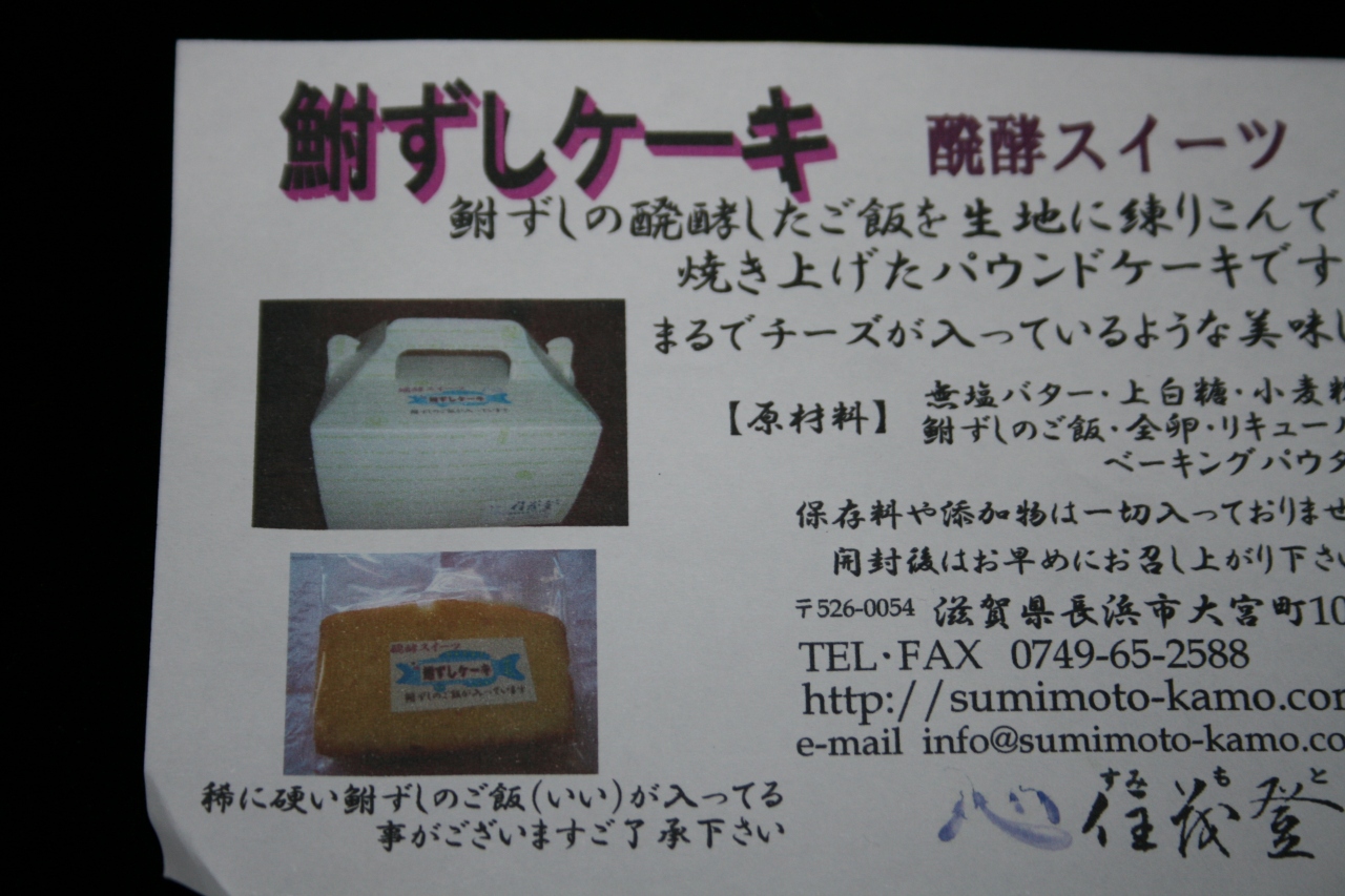 大通寺の参道にありました。観光客用?なのか、「鮒ずしケーキ」,<テイクアウト専用>がありました。