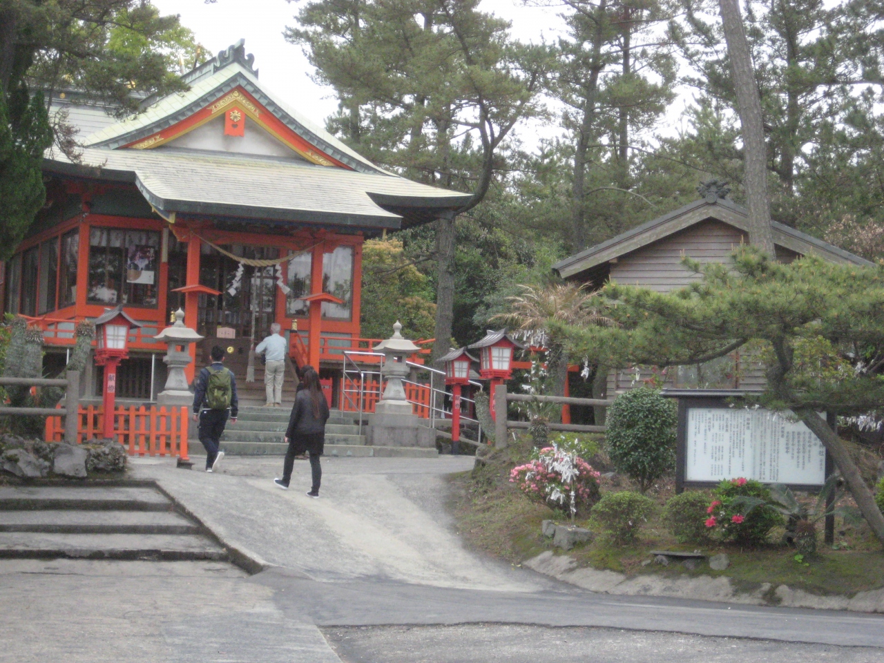 フェリー乗降場所から徒歩で5分くらいのところにあった。ジオパーク認定の1つらしく、看板があったので寄ってみた。左右ともに木々で覆われた階段を上っていくと、左右の木々がなくなり、パッと視界が開けたところに神社が見えた。小さな神社であった。