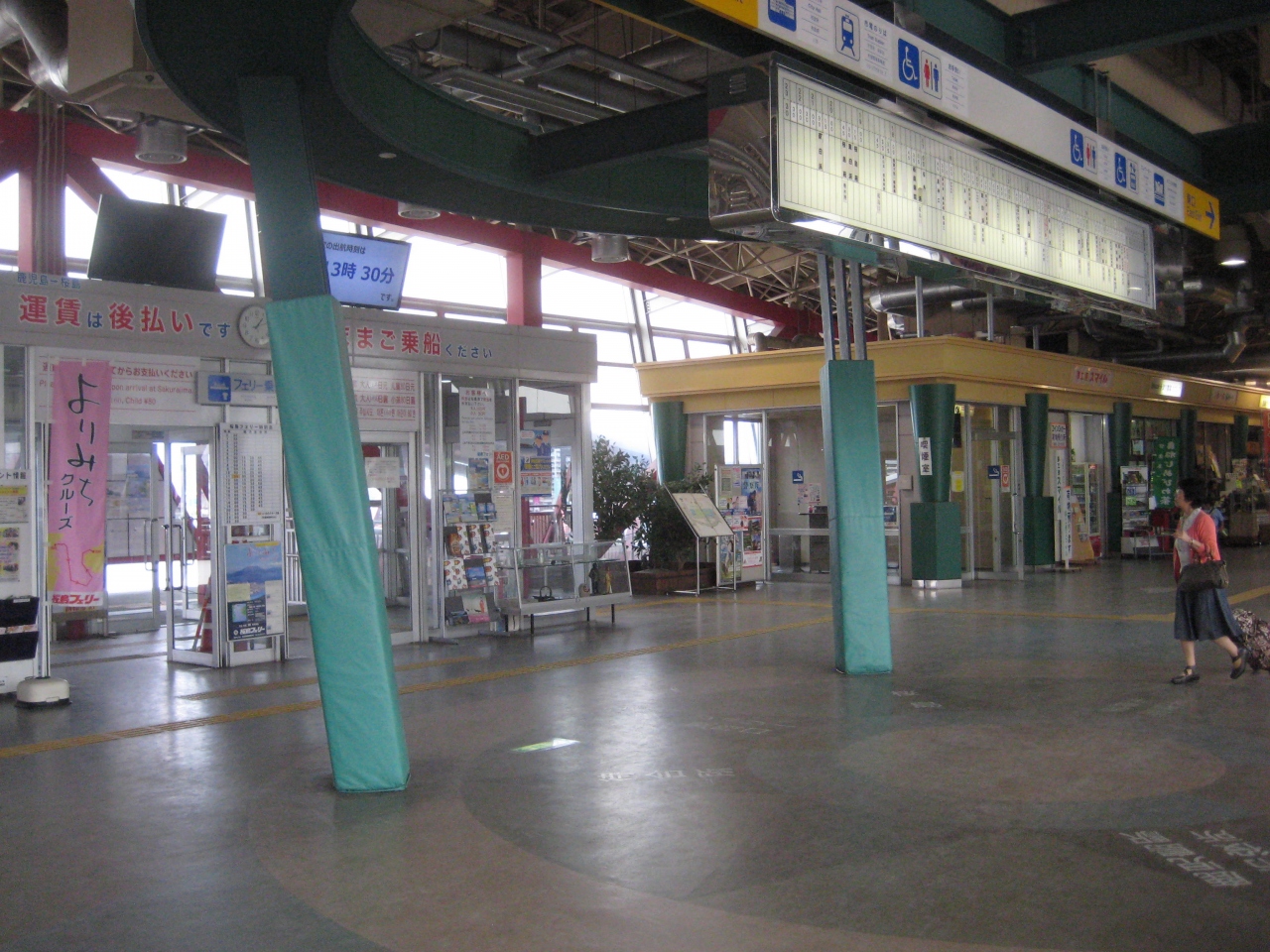 24時間営業で、土産屋、飲食店などが数件あった。待合所も完備されていて非常にきれいなターミナルだった。鹿児島側は料金は桜島での後払いのため、改札にはだれもおらず、フェリーへ直行という形だったので、ターミナルは混んでおらず静かであった。出航時間は電光掲示板で示されておりわかりやすかった。桜島の観光パンフレットは日本語、中国語、韓国語、英語が用意されており、ご自由にお取りくださいということだった。
