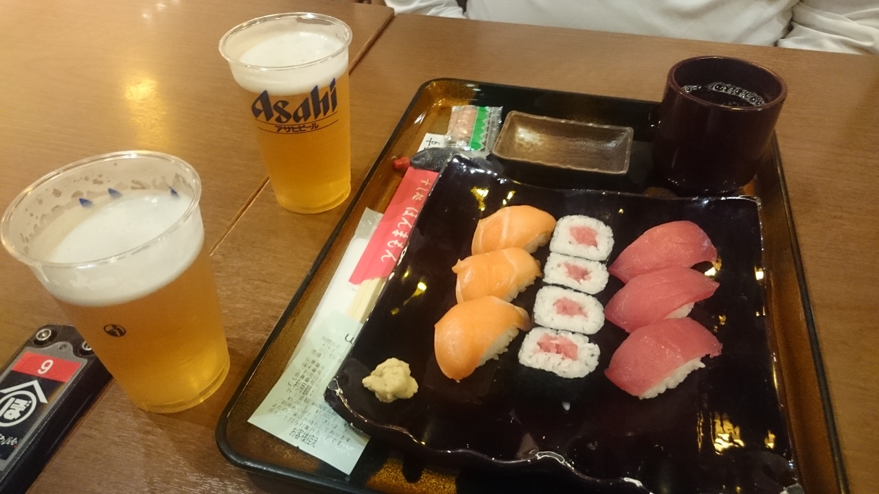 ここのスペースには他のお店もあり、いろんなものが選べるので、彼はお寿司、私はお好み焼きを選びました。
