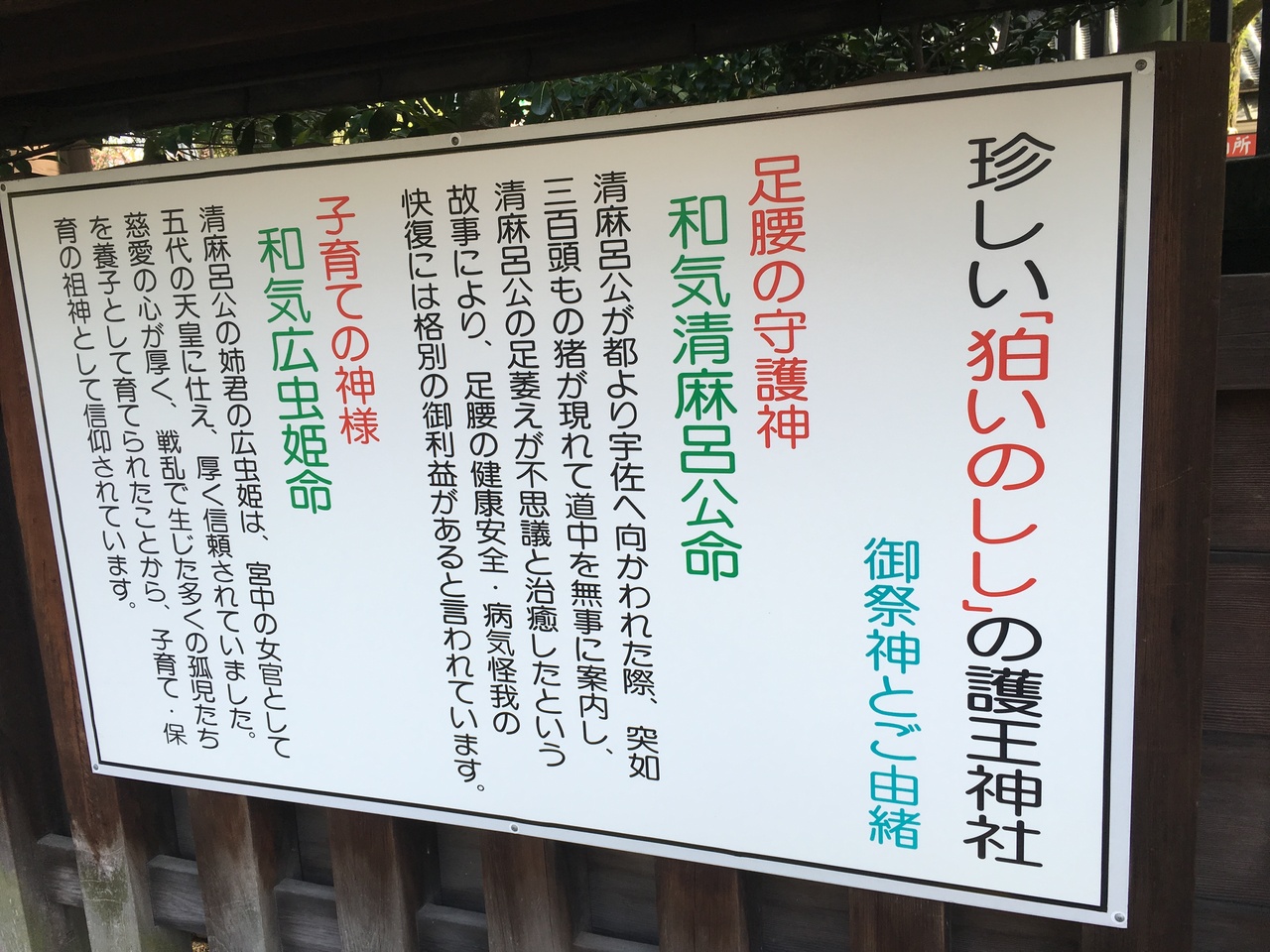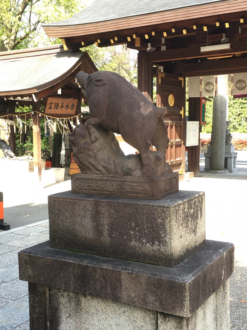 京都御苑の蛤御門から烏丸通を渡って西側にある神社です。外壁にお札の展示物があったりして目立っていました。和気清麻呂が宇佐に流布された時にイノシシが導いたとかで、イノシシがあちこちに祀られており、狛犬でなく、狛イノシシです。足腰の御利益があります。