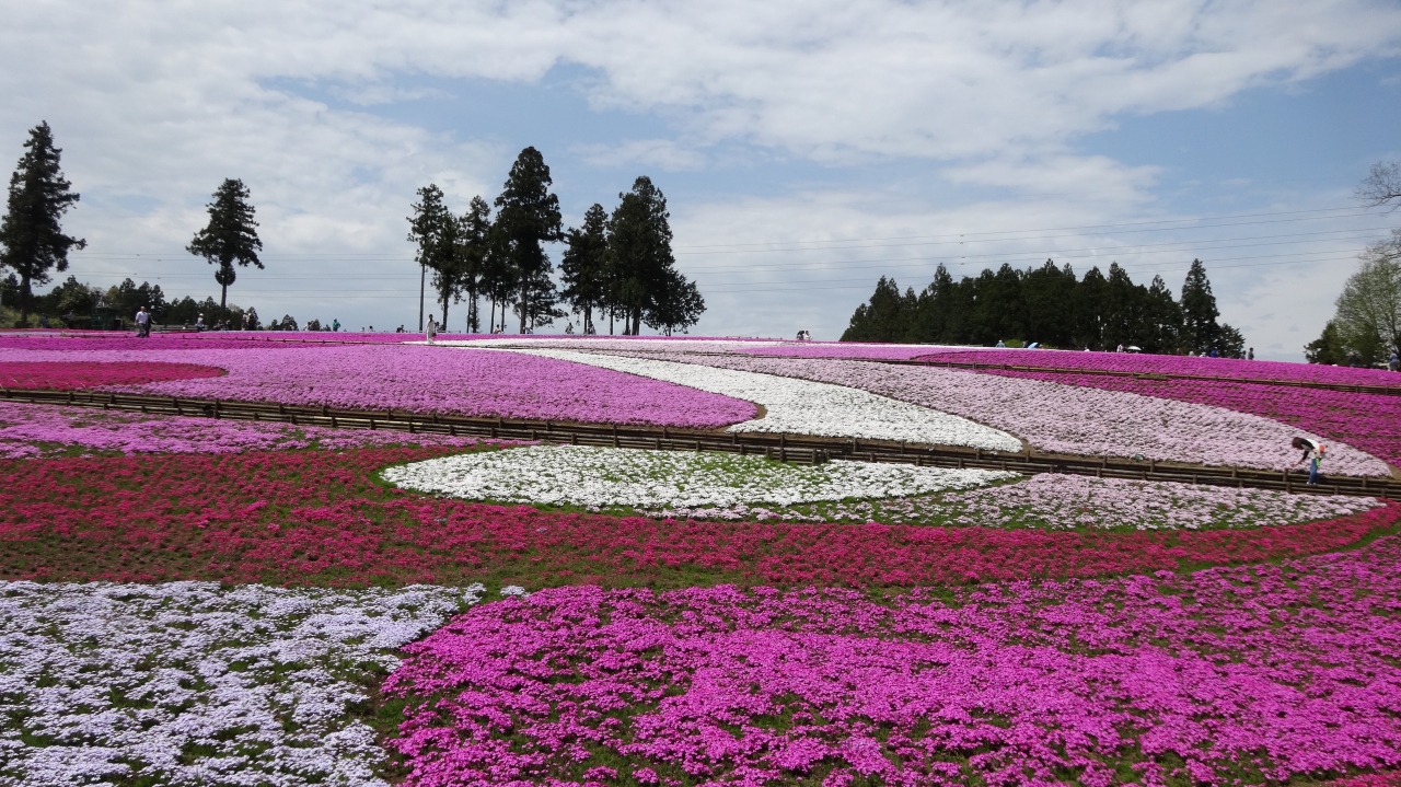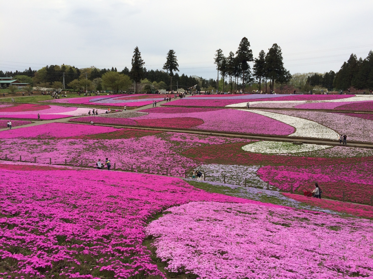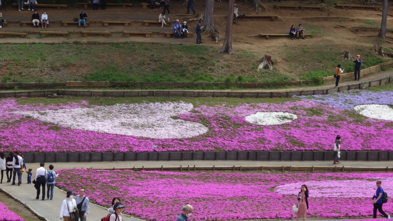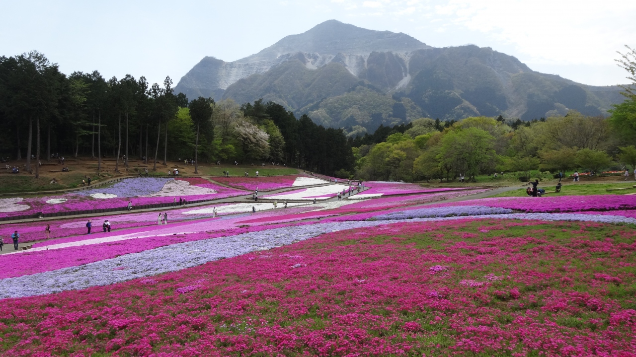 羊山公園には芝桜の丘があり、4月中旬から5月初旬に、芝桜が絨毯のように一面に咲きます。ハートの形に色分けられた芝桜もありとても綺麗です。遠くには山肌が階段状に削られた痛々しい武甲山が見えます。武甲山では石灰岩が採掘され、セメントの原料に使われるそうです。また、羊山公園の名の通り羊がいましたが、あまり見かけない黒い羊でした。