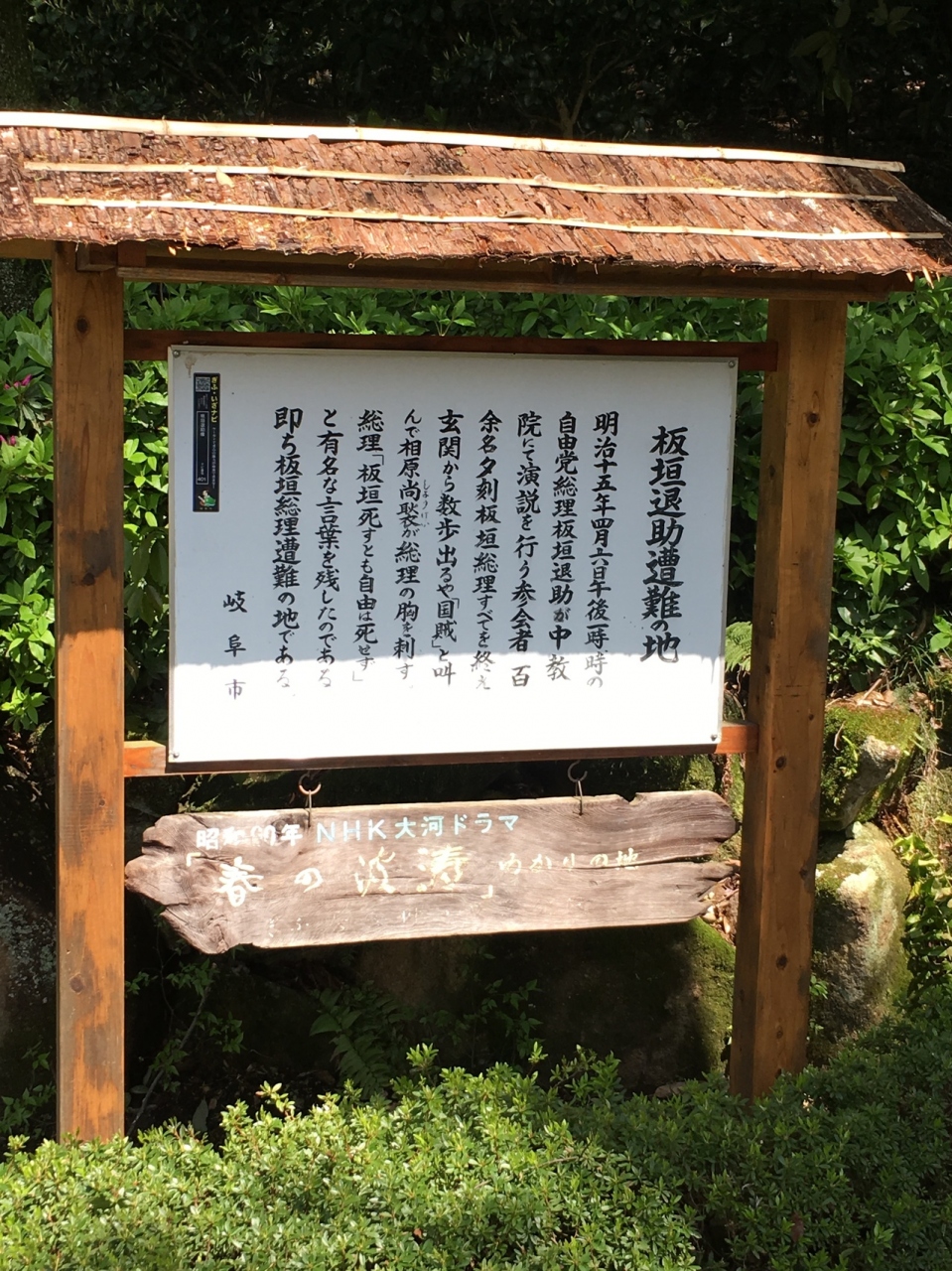 岐阜公園内を散策中に板垣退助像を発見しました。はじめは何故この場所に板垣退助像があるのか理解出来ませんでしたが、時の総理が暴漢に襲われて、ここ岐阜に避難したことから、