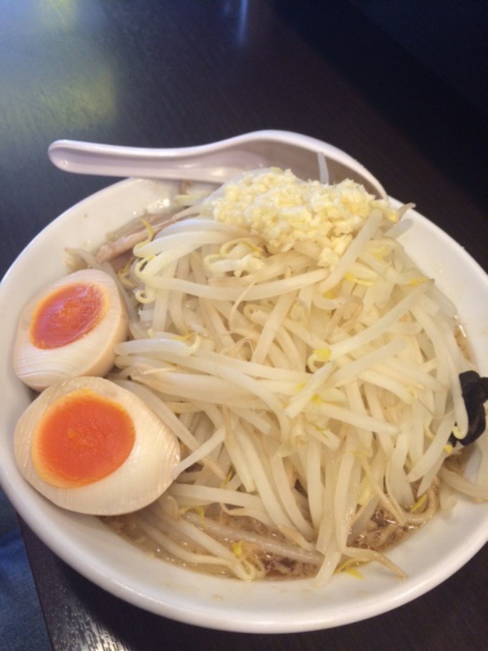 こちらは中央区でオススメの二郎インスパイア系店舗。時間帯によっては並ぶ必要もなく、かといってレベルが低いわけではない理想的なラーメン屋だ。モヤシときざみ玉ねぎ、そしてニンニクは無料オプション。めんもゴツゴツしていて食べ応えあり。