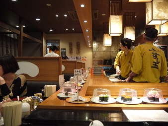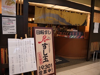金沢に来たからには海の幸を思う存分食べようと思い、百番街のくつろぎ館2階に有る「すし玉」に来ました回転すしとは思えぬ新鮮なネタ・味さすが北陸です。セルフですがあら汁が飲み放題これがまた美味しい。回転だが今回はセットで注文割安なが良い東京で食べたら3000円は超える寿司が何と1200円大満足です。