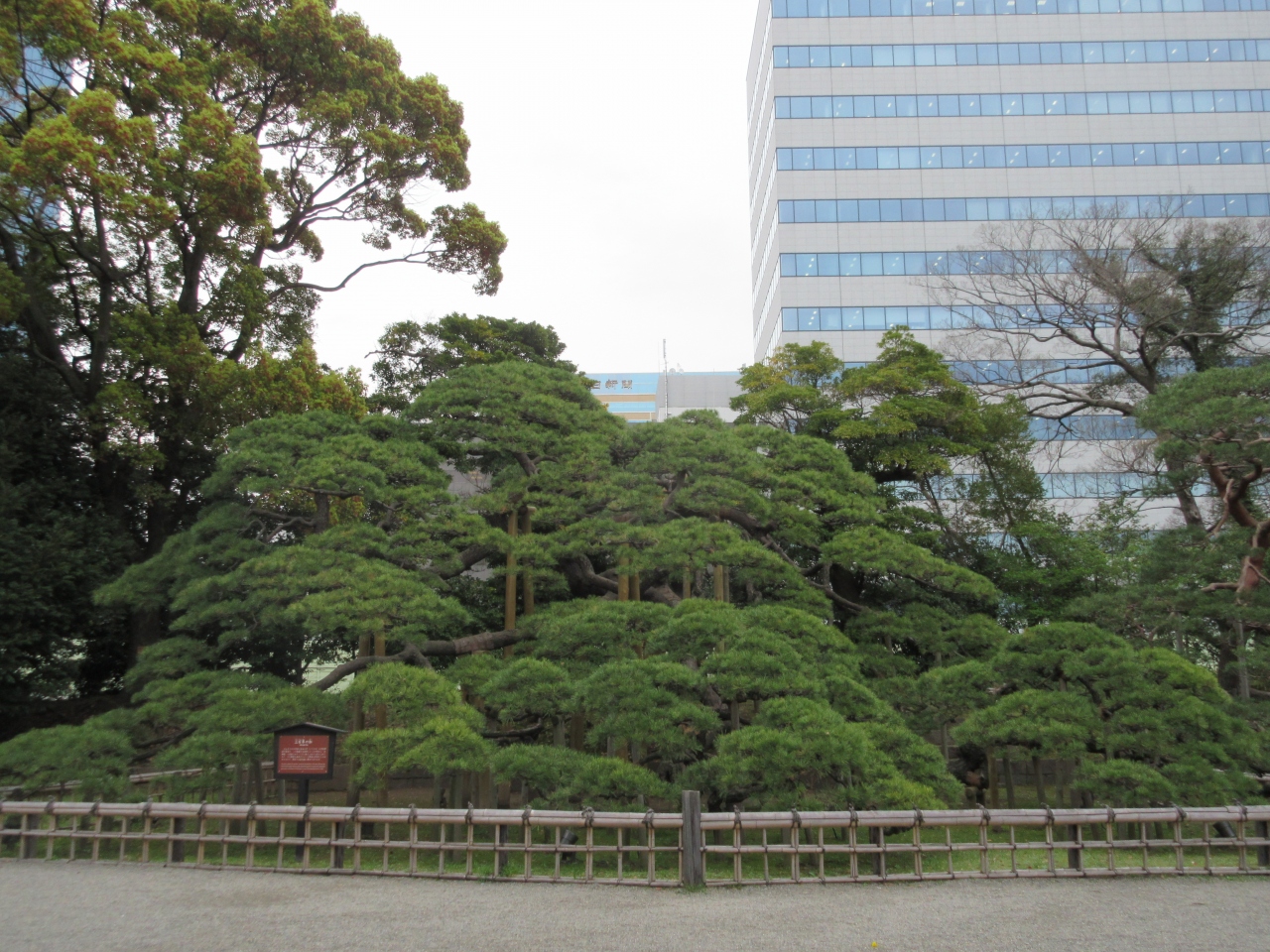 浜離宮恩賜庭園の入り口、大手門近くにある立派な松です。都内では最大級の黒松といわれています。300年前、6代将軍家宣がこの庭園を大改修し、その偉業をたたえ植えられたといいます。姿かたちの美しい、手入れが行き届いた松です。