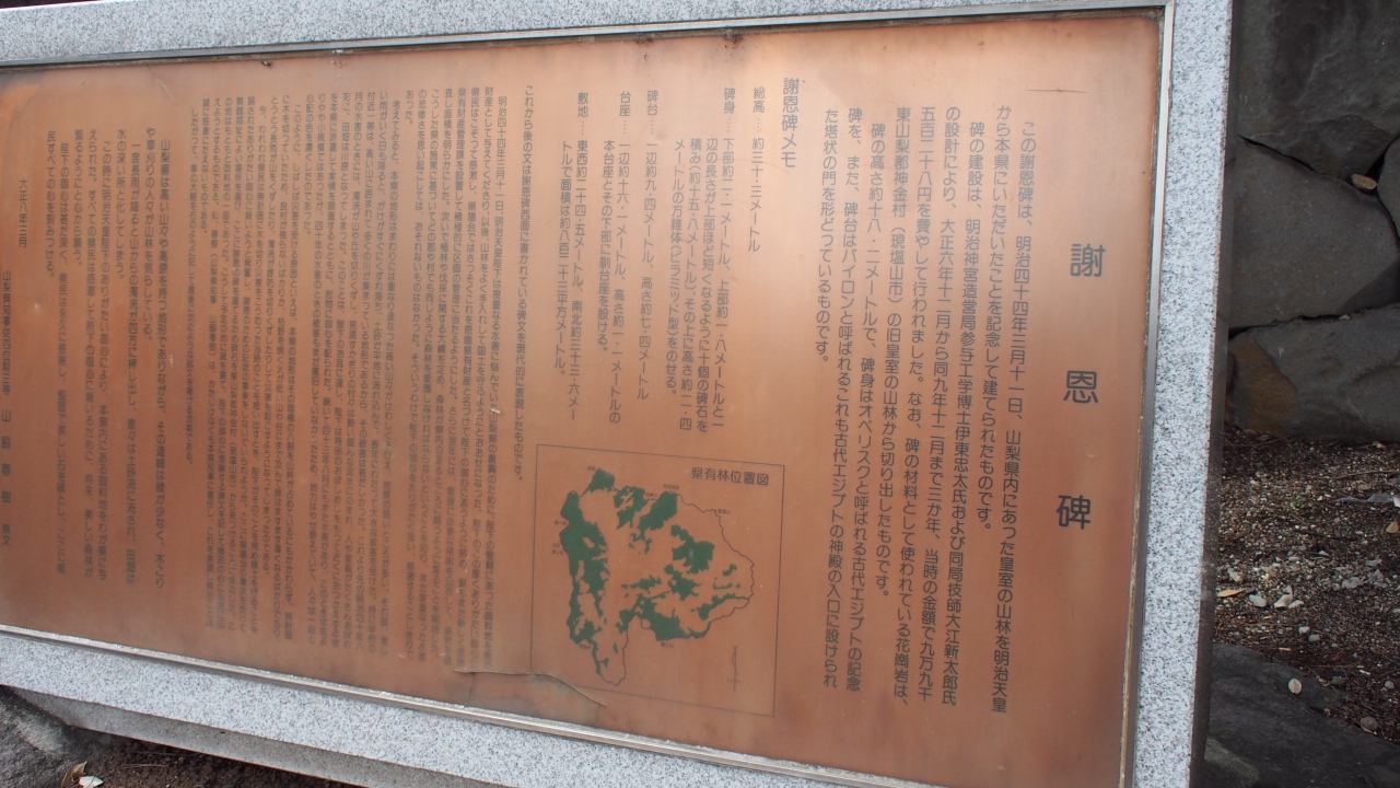 恩師謝恩碑は、明治天皇が県下の御料地のうち16万4千haを、大水害にあっていた県民の暮らしの復興のため、山梨県に御下賜されました。御下賜への感謝の念を表すため建設されたものだそうです。高さが30.3mあるそうです。