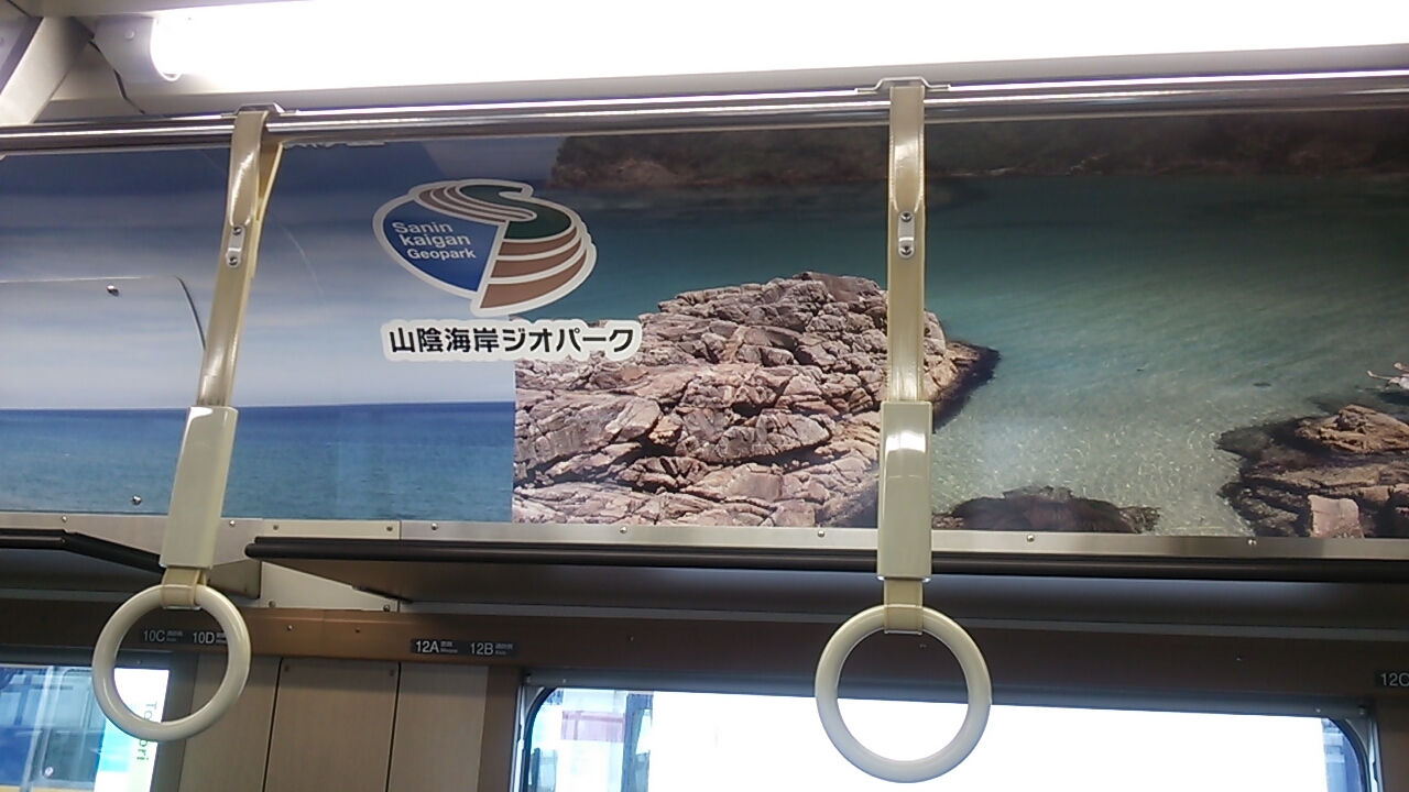 この「山陰海岸ジオパーク」というラッピング車両、車体には鳥取砂丘等沿線の観光地のイラストが描かれている他、車内の荷物棚の上の部分にも鳥取砂丘、浦富海岸、砂の美術館等の観光地のイラストが描かれていました。