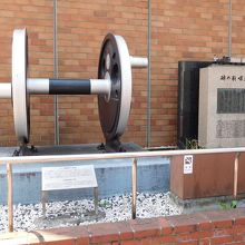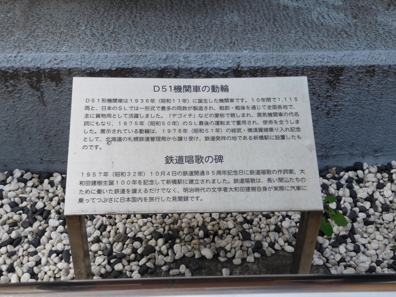 ゆりかもめ 新橋駅の近くにあります。柵に囲まれた場所に、「D51機関車の動輪」と、「鉄道唱歌の碑」があり、碑の上には、可愛らしい機関車が載っていました。ゆりかもめの乗り場に近い為、待ち合わせや休憩場所にしている人がいました。