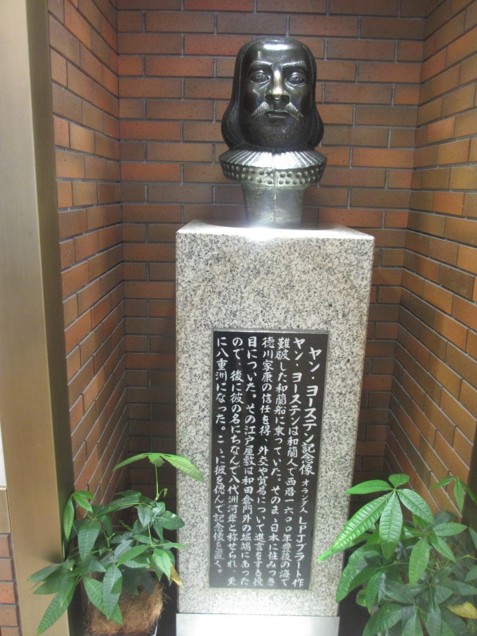東京駅八重洲地下街で、外堀地下1番通りで有楽町の方を向いて左側にあるラーメン店「遊亀亭」と寿司店「魚じま」の間にヤン ヨーステン記念像はあります。八重洲という名の由来になった人の記念像だそうです。初めて八重洲の由来を知ることができ勉強になりました。