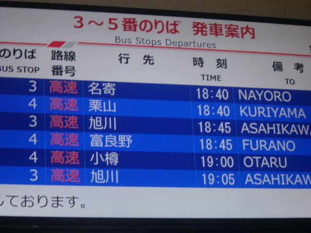 今回は高速「なよろ」号乗車の際に、大通側のバスターミナルを利用しました。こちらの待合室内には電光掲示板が2015年に新しく設置されて、目的のバス乗り場が判り易くなりました。またここは待合室内の座席数が多く、道新のニュースパネルが設置されているコーナーもあったりと、同じバスを待つのにも、札幌駅前のバスターミナルを利用する(殆どの高速バスが両者を経由します)よりも快適です。ただ、予約制でないバス(例えば旭川行き)等の場合は、駅前バスターミナルから乗らないと座れないこともありますので、混雑が予想される時間帯の予約なしルート利用の際は、面倒でも駅前バスターミナルまで移動された方が良いかと思います。