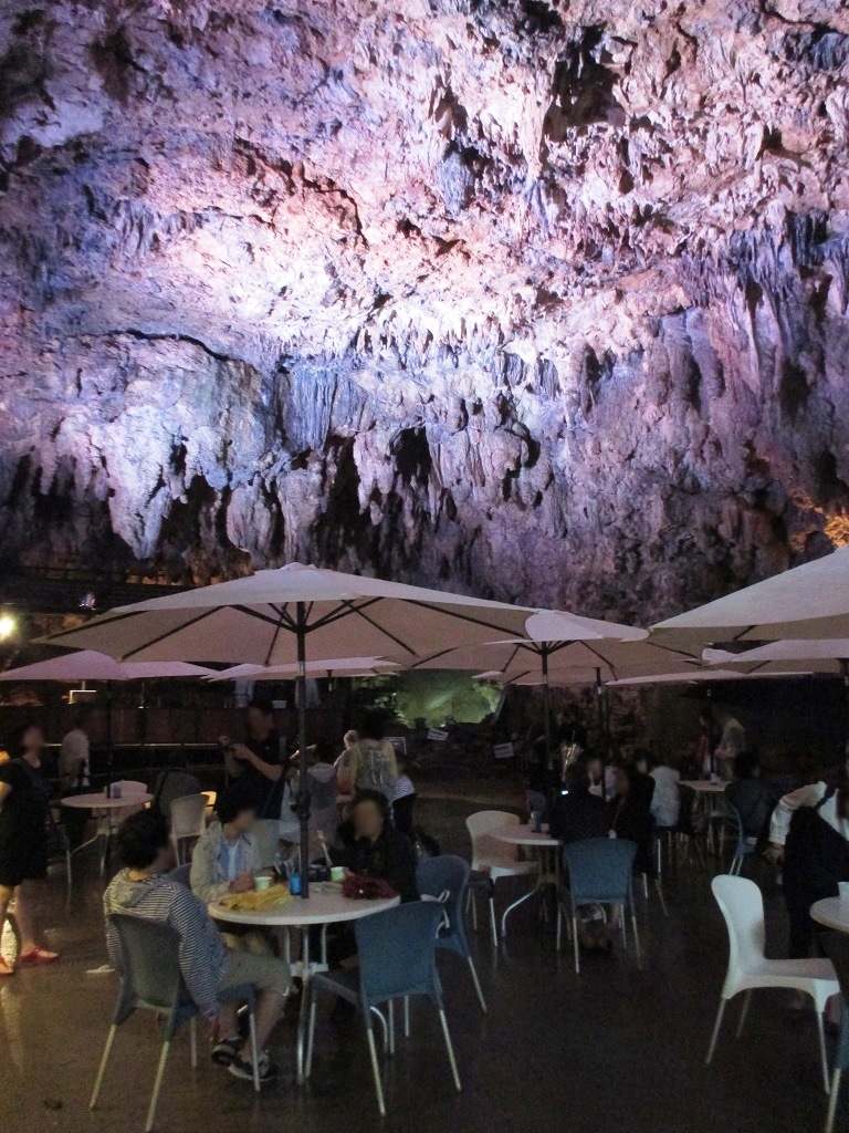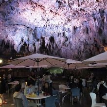 鍾乳洞の中にある喫茶スペースは、紫色の照明で照らされ、幻想的な雰囲気。