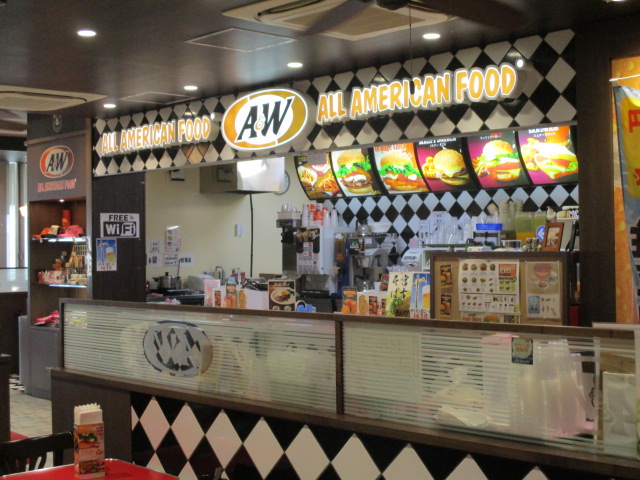 A&Wは宮古空港ターミナルビルの土産物店が並んでいる一番奥にある、お店です。椅子席が沢山あるので、ラウンジのない宮古空港でゆっくりするにはよいです。ルートビアもあります。ハンバーガーはモッツアバーガーが一番人気らしい。スライスオニオンやトマトの入った、ヘルシーで美味しいバーガーでした。でもジューシーなので服やバッグを汚さないように、ソースが垂れないように気を付けて食べないといけません。