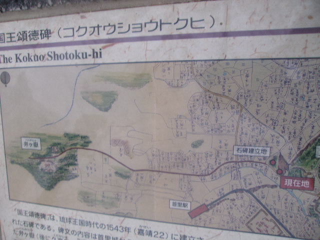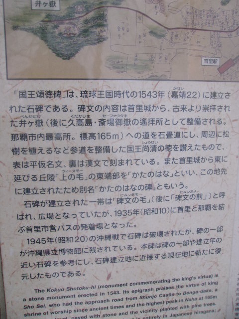 首里城の北東側、丁度ゆいレールの首里駅からお城に向かう場合、上の毛と呼ばれるお城の北東側エリアで最初に目にすることになる史跡がこちらです。現在当地にあるものは、復元されたものですが、創建当時は、上の毛から信仰対象としての弁ヶ嶽までの石畳道を整備した国王の偉業を顕彰するために建てられた碑とのことです。弁ヶ嶽自体、個人的に凄く気に入っている、現在的に言う所の那覇市内の最高峰ですので、機会があれば、往時の痕跡を辿りながら、現在は公園として整備されている弁ヶ嶽方面まで歩いてみるのも楽しいかもしれません。