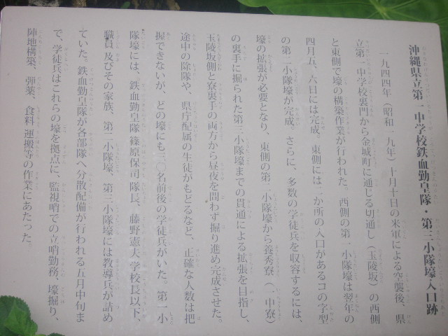 沖縄では避けて通ることのできない、戦争の悲劇を今に伝えるスポットの一つで、詳細な解説はここでは控えさせて頂きますが、とにかくここは現在の塔が建っている所の背後が、実際の防空壕のような場所として使用されたエリアになっていて、現在でも銃器庫や塹壕跡などが生々しい状態で見られるようになっています。正直、重たい気持ちになってしまう所ですので、あまり観光気分で足を運べる雰囲気ではありませんので、静かに手を合わせて平和の意味を考えたりするのが良い過ごし方かなと思います。