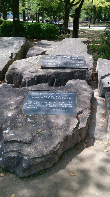 イギリスの最高峰であるベン・ネビスから切り出された石で銘板がつくられ、そこには平和のシンボルとして、広島の青年に送ると刻まれています。周囲の石は花崗岩で、広島のデルタをイメージした7つの石が据えられています。平和記念公園の原爆の子の像の裏側にあって、周辺はかなり人が居る場所ですが、立体的な石碑ではないので、人の目線に入りづらく見つけらづらいです。かなり地味なスポットというのが本音です。他の慰霊碑などを巡る際に時間があれば立ち寄るかどうかという感じです。